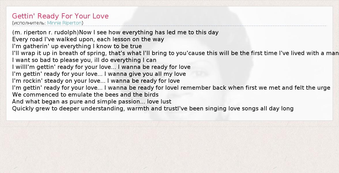 (m. riperton r. rudolph)Now I see how everything has led me to this day Every road I've walked upon, each lesson on the way I'm gatherin' up everything I know to be true I'll wrap it up in breath of spring, that's what I'll bring to you'cause this will be the first time I've lived with a man I want so bad to please you, ill do everything I can I willI'm gettin' ready for your love... I wanna be ready for love I'm gettin' ready for your love... I wanna give you all my love I'm rockin' steady on your love... I wanna be ready for love I'm gettin' ready for your love... I wanna be ready for loveI remember back when first we met and felt the urge We commenced to emulate the bees and the birds And what began as pure and simple passion... love lust Quickly grew to deeper understanding, warmth and trustI've been singing love songs all day long