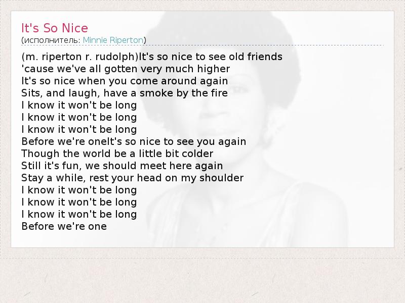 (m. riperton r. rudolph)It's so nice to see old friends 'cause we've all gotten very much higher It's so nice when you come around again Sits, and laugh, have a smoke by the fire I know it won't be long I know it won't be long I know it won't be long Before we're oneIt's so nice to see you again Though the world be a little bit colder Still it's fun, we should meet here again Stay a while, rest your head on my shoulder I know it won't be long I know it won't be long I know it won't be long Before we're one