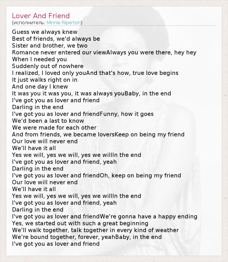 Guess we always knew Best of friends, we'd always be Sister and brother, we two Romance never entered our viewAlways you were there, hey hey When I needed you Suddenly out of nowhere I realized, I loved only youAnd that's how, true love begins It just walks right on in And one day I knew It was you it was you, it was always youBaby, in the end I've got you as lover and friend Darling in the end I've got you as lover and friendFunny, how it goes We'd been a last to know We were made for each other And from friends, we became loversKeep on being my friend Our love will never end We'll have it all Yes we will, yes we will, yes we willIn the end I've got you as lover and friend, yeah Darling in the end I've got you as lover and friendOh, keep on being my friend Our love will never end We'll have it all Yes we will, yes we will, yes we willIn the end I've got you as lover and friend, yeah Darling in the end I've got you as lover and friendWe're gonna have a happy ending Yes, we started out with such a great beginning We'll walk together, talk together in every kind of weather We're bound together, forever, yeahBaby, in the end I've got you as lover and friend