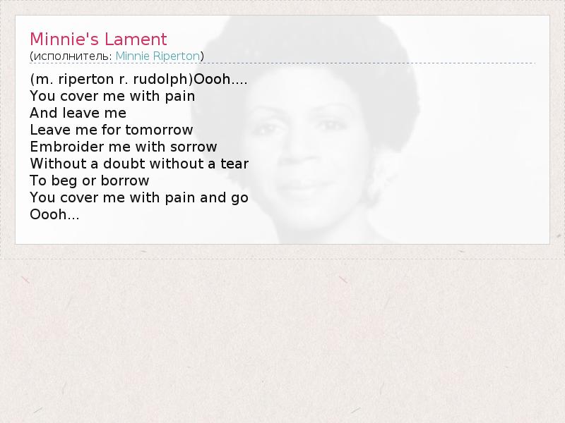 (m. riperton r. rudolph)Oooh.... You cover me with pain And leave me Leave me for tomorrow Embroider me with sorrow Without a doubt without a tear To beg or borrow You cover me with pain and go Oooh...