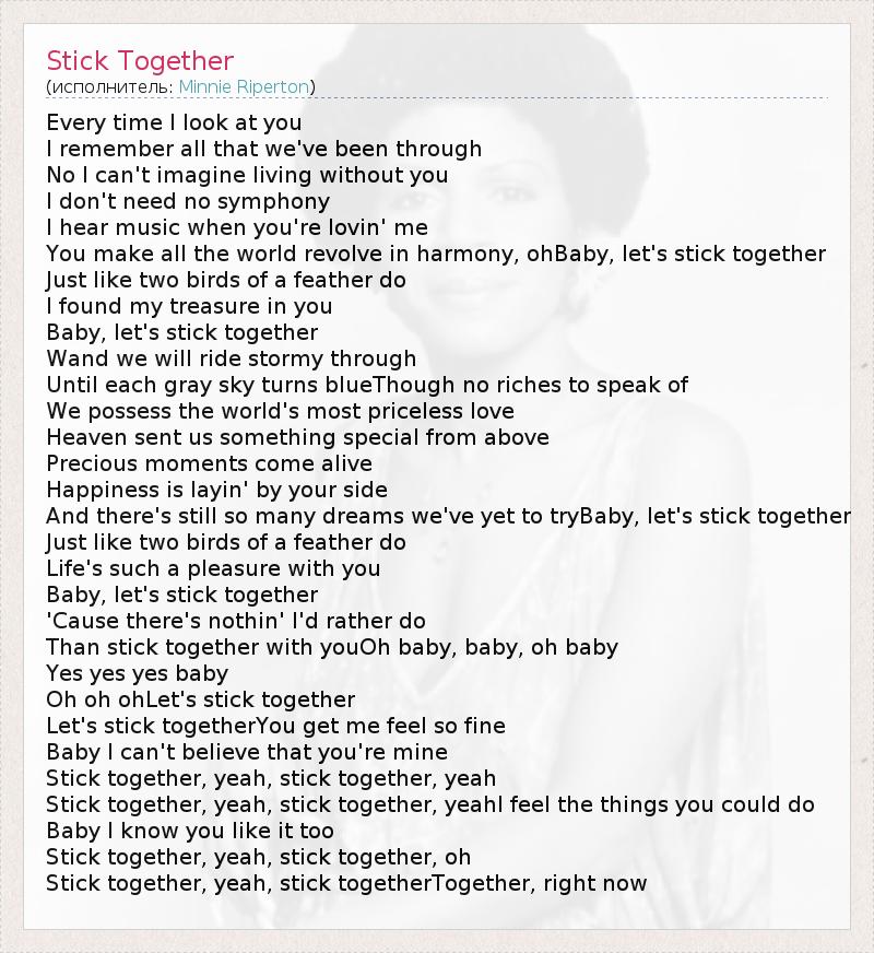 Every time I look at you I remember all that we've been through No I can't imagine living without you I don't need no symphony I hear music when you're lovin' me You make all the world revolve in harmony, ohBaby, let's stick together Just like two birds of a feather do I found my treasure in you Baby, let's stick together Wand we will ride stormy through Until each gray sky turns blueThough no riches to speak of We possess the world's most priceless love Heaven sent us something special from above Precious moments come alive Happiness is layin' by your side And there's still so many dreams we've yet to tryBaby, let's stick together Just like two birds of a feather do Life's such a pleasure with you Baby, let's stick together 'Cause there's nothin' I'd rather do Than stick together with youOh baby, baby, oh baby Yes yes yes baby Oh oh ohLet's stick together Let's stick togetherYou get me feel so fine Baby I can't believe that you're mine Stick together, yeah, stick together, yeah Stick together, yeah, stick together, yeahI feel the things you could do Baby I know you like it too Stick together, yeah, stick together, oh Stick together, yeah, stick togetherTogether, right now