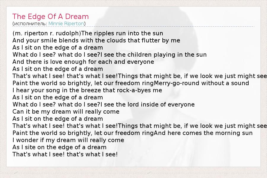 (m. riperton r. rudolph)The ripples run into the sun And your smile blends with the clouds that flutter by me As I sit on the edge of a dream What do I see? what do I see?I see the children playing in the sun And there is love enough for each and everyone As I sit on the edge of a dream That's what I see! that's what I see!Things that might be, if we look we just might see Paint the world so brightly, let our freedom ringMerry-go-round without a sound I hear your song in the breeze that rock-a-byes me As I sit on the edge of a dream What do I see? what do I see?I see the lord inside of everyone Can it be my dream will really come As I sit on the edge of a dream That's what I see! that's what I see!Things that might be, if we look we just might see Paint the world so brightly, let our freedom ringAnd here comes the morning sun I wonder if my dream will really come As I site on the edge of a dream That's what I see! that's what I see!