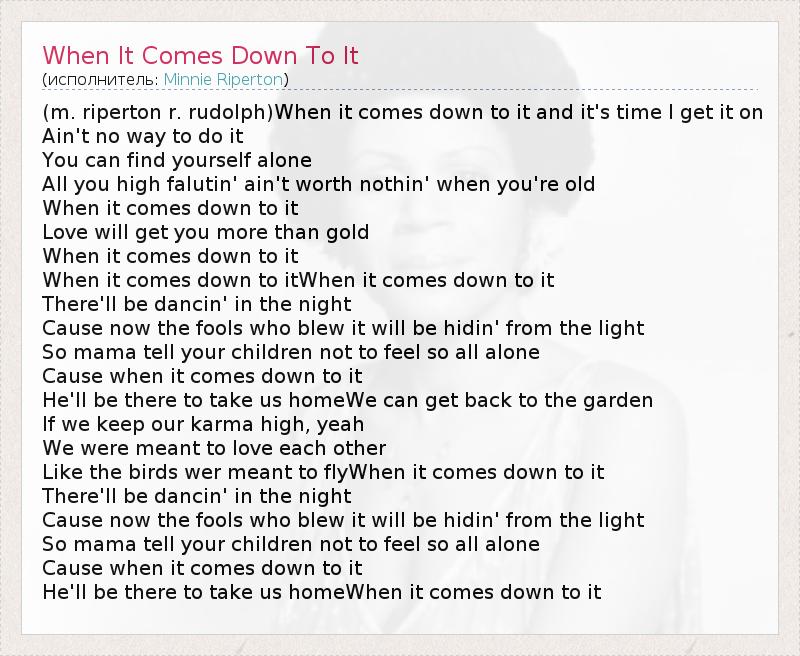 (m. riperton r. rudolph)When it comes down to it and it's time I get it on Ain't no way to do it You can find yourself alone All you high falutin' ain't worth nothin' when you're old When it comes down to it Love will get you more than gold When it comes down to it When it comes down to itWhen it comes down to it There'll be dancin' in the night Cause now the fools who blew it will be hidin' from the light So mama tell your children not to feel so all alone Cause when it comes down to it He'll be there to take us homeWe can get back to the garden If we keep our karma high, yeah We were meant to love each other Like the birds wer meant to flyWhen it comes down to it There'll be dancin' in the night Cause now the fools who blew it will be hidin' from the light So mama tell your children not to feel so all alone Cause when it comes down to it He'll be there to take us homeWhen it comes down to it