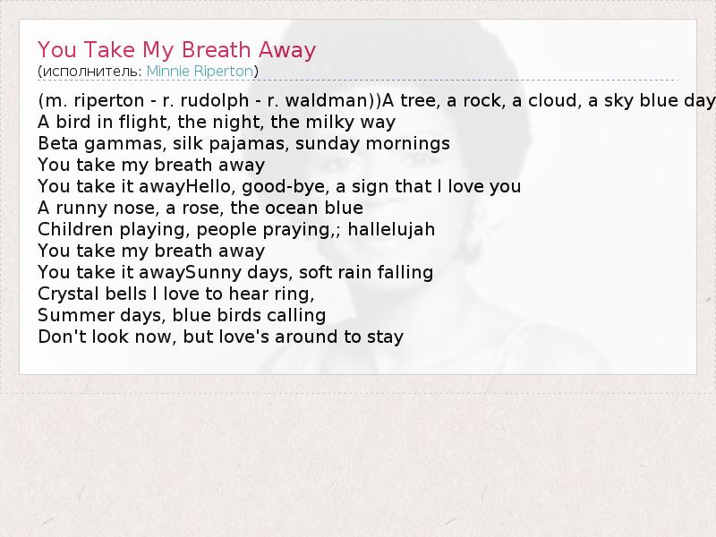 (m. riperton - r. rudolph - r. waldman))A tree, a rock, a cloud, a sky blue day A bird in flight, the night, the milky way Beta gammas, silk pajamas, sunday mornings You take my breath away You take it awayHello, good-bye, a sign that I love you A runny nose, a rose, the ocean blue Children playing, people praying,; hallelujah You take my breath away You take it awaySunny days, soft rain falling Crystal bells I love to hear ring, Summer days, blue birds calling Don't look now, but love's around to stay