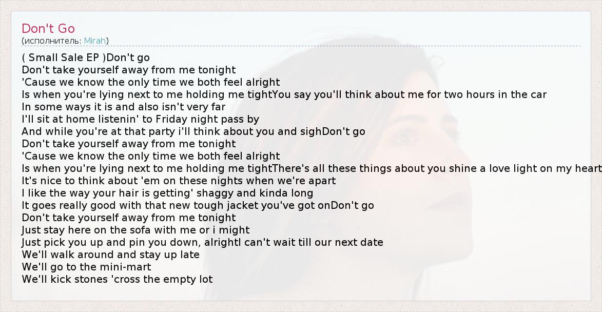 ( Small Sale EP )Don't go Don't take yourself away from me tonight 'Cause we know the only time we both feel alright Is when you're lying next to me holding me tightYou say you'll think about me for two hours in the car In some ways it is and also isn't very far I'll sit at home listenin' to Friday night pass by And while you're at that party i'll think about you and sighDon't go Don't take yourself away from me tonight 'Cause we know the only time we both feel alright Is when you're lying next to me holding me tightThere's all these things about you shine a love light on my heart It's nice to think about 'em on these nights when we're apart I like the way your hair is getting' shaggy and kinda long It goes really good with that new tough jacket you've got onDon't go Don't take yourself away from me tonight Just stay here on the sofa with me or i might Just pick you up and pin you down, alrightI can't wait till our next date We'll walk around and stay up late We'll go to the mini-mart We'll kick stones 'cross the empty lot