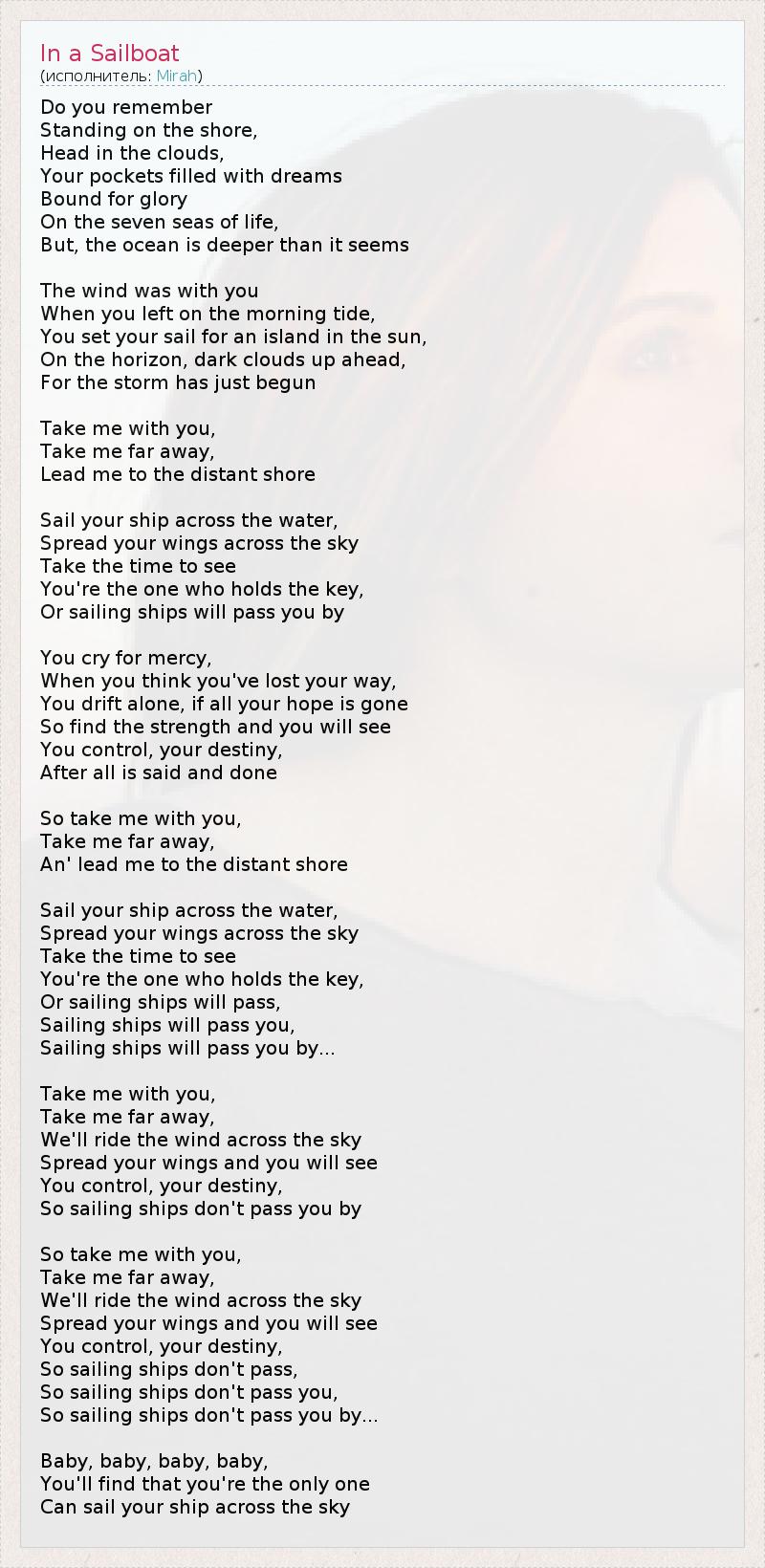 Ты помнишь, Стоя на берегу, Витая в облаках, С мечтами в голове, Жаждущая славы В бескрайних морских просторах жизни. Но океан глубже, чем кажется Был попутный ветер, Когда ты ушла в море с утра. Ты поставила паруса к острову в лучах солнца. Впереди на горизонте темные облака, Поскольку начался шторм Возьми меня с собой, Возьми меня на край света, Приведи к далеким берегам Пересеки под парусом море, Расправь крылья в небе, Повремени, чтобы заметить, Ты – единственная, у кого есть ключ, Или же парусные корабли пройдут мимо Ты молишь о снисхождении, Когда думаешь, что сбилась с пути, Ты дрейфуешь в одиночестве, если надежда ушла. Так найди силы и ты увидишь, Твоя судьба подвластна тебе Несмотря ни на что, в конце концов Возьми меня с собой, Возьми меня на край света, И приведи к далеким берегам Пересеки под парусом море, Расправь крылья в небе, Повремени, чтобы заметить, Ты – единственная, у кого есть ключ, Или же парусные корабли пройдут Парусные корабли пройдут мимо Парусные корабли пройдут мимо тебя… Возьми меня с собой, Возьми меня на край света, Мы оседлаем ветер в небе. Расправь крылья и ты увидишь Твоя судьба подвластна тебе Так что, парусные корабли не пройдут мимо Так возьми меня с собой, Возьми меня на край света, Мы оседлаем ветер в небе. Расправь крылья и ты увидишь Твоя судьба подвластна тебе Так что, парусные корабли не пройдут Так что, парусные корабли не пройдут мимо Так что, парусные корабли не пройдут мимо тебя… Детка, детка, детка, детка, Ты поймешь, что ты единственная, Кто может провести твой корабль под парусом по небу
