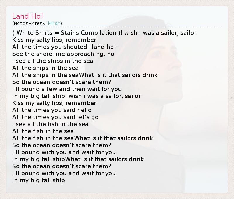 ( White Shirts = Stains Compilation )I wish i was a sailor, sailor Kiss my salty lips, remember All the times you shouted "land ho!" See the shore line approaching, ho I see all the ships in the sea All the ships in the sea All the ships in the seaWhat is it that sailors drink So the ocean doesn't scare them? I'll pound a few and then wait for you In my big tall shipI wish i was a sailor, sailor Kiss my salty lips, remember All the times you said hello All the times you said let's go I see all the fish in the sea All the fish in the sea All the fish in the seaWhat is it that sailors drink So the ocean doesn't scare them? I'll pound with you and wait for you In my big tall shipWhat is it that sailors drink So the ocean doesn't scare them? I'll pound with you and wait for you In my big tall ship