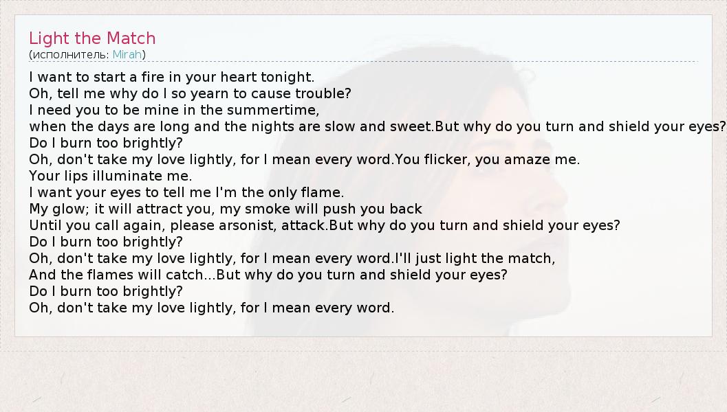 А как ты думаешь, о чем песня "Light the Match" ?