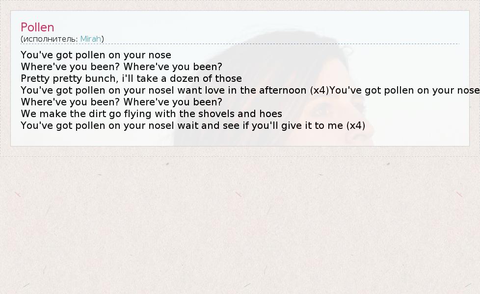You've got pollen on your nose Where've you been? Where've you been? Pretty pretty bunch, i'll take a dozen of those You've got pollen on your noseI want love in the afternoon (x4)You've got pollen on your nose Where've you been? Where've you been? We make the dirt go flying with the shovels and hoes You've got pollen on your noseI wait and see if you'll give it to me (x4)