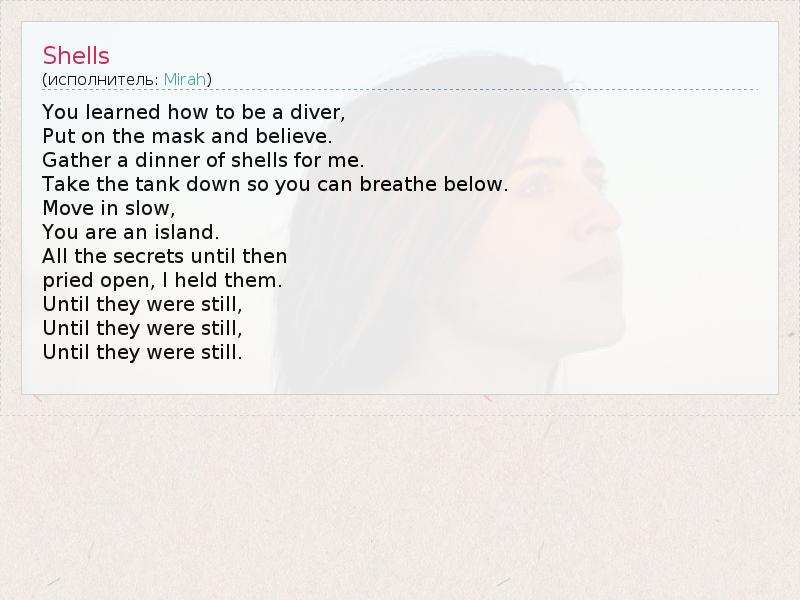You learned how to be a diver, Put on the mask and believe. Gather a dinner of shells for me. Take the tank down so you can breathe below. Move in slow, You are an island. All the secrets until then pried open, I held them. Until they were still, Until they were still, Until they were still.