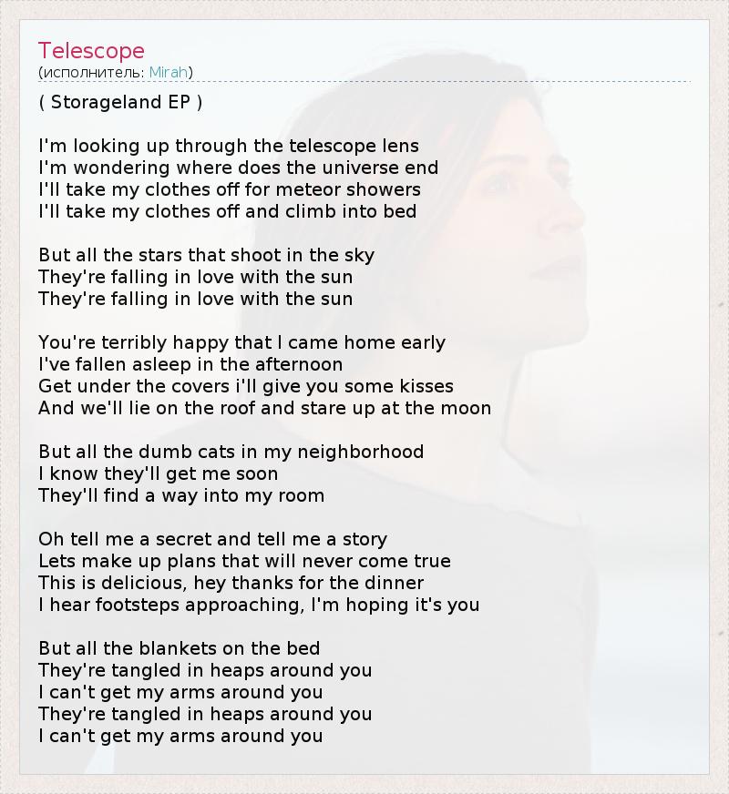 ( Storageland EP ) I'm looking up through the telescope lens I'm wondering where does the universe end I'll take my clothes off for meteor showers I'll take my clothes off and climb into bed But all the stars that shoot in the sky They're falling in love with the sun They're falling in love with the sun You're terribly happy that I came home early I've fallen asleep in the afternoon Get under the covers i'll give you some kisses And we'll lie on the roof and stare up at the moon But all the dumb cats in my neighborhood I know they'll get me soon They'll find a way into my room Oh tell me a secret and tell me a story Lets make up plans that will never come true This is delicious, hey thanks for the dinner I hear footsteps approaching, I'm hoping it's you But all the blankets on the bed They're tangled in heaps around you I can't get my arms around you They're tangled in heaps around you I can't get my arms around you