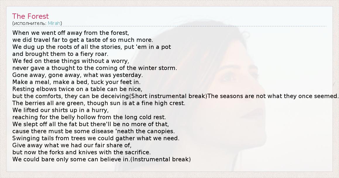 Это интересно:The Pacific Northwest's Mirah (полное имя Мира Йом Тов Зейтлин/Mirah Yom Tov Zeitlyn) была региональной ухоженной тайной в течение многих лет. Её карьера началась очень удачно, благодаря двум великолепным альбомам, выпущенным на Olympia's K Records, обе она записала при помощи великого Фила Элврума/Phil Elvrum из Microphones, на чьих альбомах часто звучит голос Mirah.В 2000 году Мира выпустила свой дебютный альбом с 16 песнями... продолжение