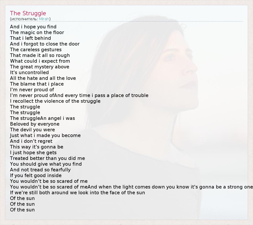 And i hope you find The magic on the floor That i left behind And i forgot to close the door The careless gestures That made it all so rough What could i expect from The great mystery above It's uncontrolled All the hate and all the love The blame that i place I'm never proud of I'm never proud ofAnd every time i pass a place of trouble I recollect the violence of the struggle The struggle The struggle The struggleAn angel i was Beloved by everyone The devil you were Just what i made you become And i don't regret This way it's gonna be I just hope she gets Treated better than you did me You should give what you find And not tread so fearfully If you felt good inside You wouldn't be so scared of me You wouldn't be so scared of meAnd when the light comes down you know it's gonna be a strong one If we're still both around we look into the face of the sun Of the sun Of the sun Of the sun