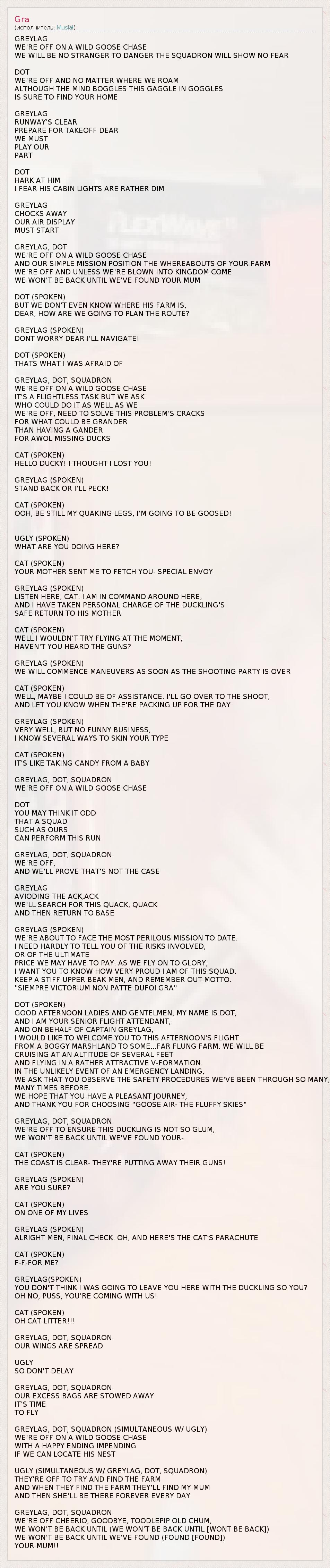 GREYLAG WE'RE OFF ON A WILD GOOSE CHASE WE WILL BE NO STRANGER TO DANGER THE SQUADRON WILL SHOW NO FEAR DOT WE'RE OFF AND NO MATTER WHERE WE ROAM ALTHOUGH THE MIND BOGGLES THIS GAGGLE IN GOGGLES IS SURE TO FIND YOUR HOME GREYLAG RUNWAY'S CLEAR PREPARE FOR TAKEOFF DEAR WE MUST PLAY OUR PART DOT HARK AT HIM I FEAR HIS CABIN LIGHTS ARE RATHER DIM GREYLAG CHOCKS AWAY OUR AIR DISPLAY MUST START GREYLAG, DOT WE'RE OFF ON A WILD GOOSE CHASE AND OUR SIMPLE MISSION POSITION THE WHEREABOUTS OF YOUR FARM WE'RE OFF AND UNLESS WE'RE BLOWN INTO KINGDOM COME WE WON'T BE BACK UNTIL WE'VE FOUND YOUR MUM DOT (SPOKEN) BUT WE DON'T EVEN KNOW WHERE HIS FARM IS, DEAR, HOW ARE WE GOING TO PLAN THE ROUTE? GREYLAG (SPOKEN) DONT WORRY DEAR I'LL NAVIGATE! DOT (SPOKEN) THATS WHAT I WAS AFRAID OF GREYLAG, DOT, SQUADRON WE'RE OFF ON A WILD GOOSE CHASE IT'S A FLIGHTLESS TASK BUT WE ASK WHO COULD DO IT AS WELL AS WE WE'RE OFF, NEED TO SOLVE THIS PROBLEM'S CRACKS FOR WHAT COULD BE GRANDER THAN HAVING A GANDER FOR AWOL MISSING DUCKS CAT (SPOKEN) HELLO DUCKY! I THOUGHT I LOST YOU! GREYLAG (SPOKEN) STAND BACK OR I'LL PECK! CAT (SPOKEN) OOH, BE STILL MY QUAKING LEGS, I'M GOING TO BE GOOSED! UGLY (SPOKEN) WHAT ARE YOU DOING HERE? CAT (SPOKEN) YOUR MOTHER SENT ME TO FETCH YOU- SPECIAL ENVOY GREYLAG (SPOKEN) LISTEN HERE, CAT. I AM IN COMMAND AROUND HERE, AND I HAVE TAKEN PERSONAL CHARGE OF THE DUCKLING'S SAFE RETURN TO HIS MOTHER CAT (SPOKEN) WELL I WOULDN'T TRY FLYING AT THE MOMENT, HAVEN'T YOU HEARD THE GUNS? GREYLAG (SPOKEN) WE WILL COMMENCE MANEUVERS AS SOON AS THE SHOOTING PARTY IS OVER CAT (SPOKEN) WELL, MAYBE I COULD BE OF ASSISTANCE. I'LL GO OVER TO THE SHOOT, AND LET YOU KNOW WHEN THE'RE PACKING UP FOR THE DAY GREYLAG (SPOKEN) VERY WELL, BUT NO FUNNY BUSINESS, I KNOW SEVERAL WAYS TO SKIN YOUR TYPE CAT (SPOKEN) IT'S LIKE TAKING CANDY FROM A BABY GREYLAG, DOT, SQUADRON WE'RE OFF ON A WILD GOOSE CHASE DOT YOU MAY THINK IT ODD THAT A SQUAD SUCH AS OURS CAN PERFORM THIS RUN GREYLAG, DOT, SQUADRON WE'RE OFF, AND WE'LL PROVE THAT'S NOT THE CASE GREYLAG AVIODING THE ACK,ACK WE'LL SEARCH FOR THIS QUACK, QUACK AND THEN RETURN TO BASE GREYLAG (SPOKEN) WE'RE ABOUT TO FACE THE MOST PERILOUS MISSION TO DATE. I NEED HARDLY TO TELL YOU OF THE RISKS INVOLVED, OR OF THE ULTIMATE PRICE WE MAY HAVE TO PAY. AS WE FLY ON TO GLORY, I WANT YOU TO KNOW HOW VERY PROUD I AM OF THIS SQUAD. KEEP A STIFF UPPER BEAK MEN, AND REMEMBER OUT MOTTO. "SIEMPRE VICTORIUM NON PATTE DUFOI GRA" DOT (SPOKEN) GOOD AFTERNOON LADIES AND GENTELMEN, MY NAME IS DOT, AND I AM YOUR SENIOR FLIGHT ATTENDANT, AND ON BEHALF OF CAPTAIN GREYLAG, I WOULD LIKE TO WELCOME YOU TO THIS AFTERNOON'S FLIGHT FROM A BOGGY MARSHLAND TO SOME...FAR FLUNG FARM. WE WILL BE CRUISING AT AN ALTITUDE OF SEVERAL FEET AND FLYING IN A RATHER ATTRACTIVE V-FORMATION. IN THE UNLIKELY EVENT OF AN EMERGENCY LANDING, WE ASK THAT YOU OBSERVE THE SAFETY PROCEDURES WE'VE BEEN THROUGH SO MANY, MANY TIMES BEFORE. WE HOPE THAT YOU HAVE A PLEASANT JOURNEY, AND THANK YOU FOR CHOOSING "GOOSE AIR- THE FLUFFY SKIES" GREYLAG, DOT, SQUADRON WE'RE OFF TO ENSURE THIS DUCKLING IS NOT SO GLUM, WE WON'T BE BACK UNTIL WE'VE FOUND YOUR- CAT (SPOKEN) THE COAST IS CLEAR- THEY'RE PUTTING AWAY THEIR GUNS! GREYLAG (SPOKEN) ARE YOU SURE? CAT (SPOKEN) ON ONE OF MY LIVES GREYLAG (SPOKEN) ALRIGHT MEN, FINAL CHECK. OH, AND HERE'S THE CAT'S PARACHUTE CAT (SPOKEN) F-F-FOR ME? GREYLAG(SPOKEN) YOU DON'T THINK I WAS GOING TO LEAVE YOU HERE WITH THE DUCKLING SO YOU? OH NO, PUSS, YOU'RE COMING WITH US! CAT (SPOKEN) OH CAT LITTER!!! GREYLAG, DOT, SQUADRON OUR WINGS ARE SPREAD UGLY SO DON'T DELAY GREYLAG, DOT, SQUADRON OUR EXCESS BAGS ARE STOWED AWAY IT'S TIME TO FLY GREYLAG, DOT, SQUADRON (SIMULTANEOUS W/ UGLY) WE'RE OFF ON A WILD GOOSE CHASE WITH A HAPPY ENDING IMPENDING IF WE CAN LOCATE HIS NEST UGLY (SIMULTANEOUS W/ GREYLAG, DOT, SQUADRON) THEY'RE OFF TO TRY AND FIND THE FARM AND WHEN THEY FIND THE FARM THEY'LL FIND MY MUM AND THEN SHE'LL BE THERE FOREVER EVERY DAY GREYLAG, DOT, SQUADRON WE'RE OFF CHEERIO, GOODBYE, TOODLEPIP OLD CHUM, WE WON'T BE BACK UNTIL (WE WON'T BE BACK UNTIL [WONT BE BACK]) WE WON'T BE BACK UNTIL WE'VE FOUND (FOUND [FOUND]) YOUR MUM!!