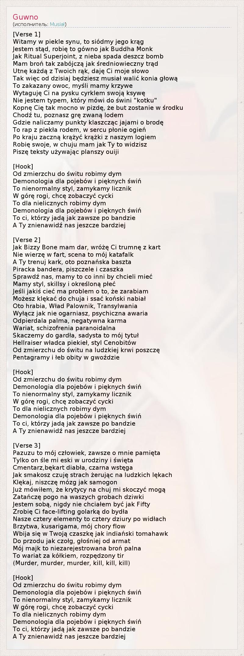 [Verse 1] Witamy w piekle synu, to siódmy jego krąg Jestem stąd, robię to gówno jak Buddha Monk Jak Ritual Superjoint, z nieba spada deszcz bomb Mam broń tak zabójczą jak średniowieczny trąd Utnę każdą z Twoich rąk, daję Ci moje słowo Tak więc od dzisiaj będziesz musiał walić konia głową To zakazany owoc, myśli mamy krzywe Wytaguję Ci na pysku cyrklem swoją ksywę Nie jestem typem, który mówi do świni "kotku" Kopnę Cię tak mocno w pizdę, że but zostanie w środku Chodź tu, poznasz grę zwaną lodem Gdzie naliczamy punkty klaszcząc jajami o brodę To rap z piekła rodem, w sercu płonie ogień Po kraju zaczną krążyć krążki z naszym logiem Robię swoje, w chuju mam jak Ty to widzisz Piszę teksty używając planszy ouiji [Hook] Od zmierzchu do świtu robimy dym Demonologia dla pojebów i pięknych świń To nienormalny styl, zamykamy licznik W górę rogi, chcę zobaczyć cycki To dla nielicznych robimy dym Demonologia dla pojebów i pięknych świń To ci, którzy jadą jak zawsze po bandzie A Ty znienawidź nas jeszcze bardziej [Verse 2] Jak Bizzy Bone mam dar, wróżę Ci trumnę z kart Nie wierzę w fart, scena to mój katafalk A Ty trenuj kark, oto poznańska baszta Piracka bandera, piszczele i czaszka Sprawdź nas, mamy to co inni by chcieli mieć Mamy styl, skillsy i określoną płeć Jeśli jakiś cieć ma problem o to, że zarabiam Możesz klękać do chuja i ssać koński nabiał Oto hrabia, Wład Palownik, Transylwania Wyłącz jak nie ogarniasz, psychiczna awaria Odpierdala palma, negatywna karma Wariat, schizofrenia paranoidalna Skaczemy do gardła, sadysta to mój tytuł Hellraiser władca piekieł, styl Cenobitów Od zmierzchu do świtu na ludzkiej krwi poszczę Pentagramy i łeb obity w gwoździe [Hook] Od zmierzchu do świtu robimy dym Demonologia dla pojebów i pięknych świń To nienormalny styl, zamykamy licznik W górę rogi, chcę zobaczyć cycki To dla nielicznych robimy dym Demonologia dla pojebów i pięknych świń To ci, którzy jadą jak zawsze po bandzie A Ty znienawidź nas jeszcze bardziej [Verse 3] Pazuzu to mój człowiek, zawsze o mnie pamięta Tylko on śle mi eski w urodziny i święta Cmentarz,bękart diabła, czarna wstęga Jak smakosz czuję strach żerując na ludzkich lękach Klękaj, niszczę mózg jak samogon Już mówiłem, że krytycy na chuj mi skoczyć mogą Zatańczę pogo na waszych grobach dziwki Jestem sobą, nigdy nie chciałem być jak Fifty Zrobię Ci face-lifting golarką do bydła Nasze cztery elementy to cztery dziury po widłach Brzytwa, kusarigama, mój chory flow Wbija się w Twoją czaszkę jak indiański tomahawk Do przodu jak czołg, głośniej od armat Mój majk to niezarejestrowana broń palna To wariat za kółkiem, rozpędzony tir (Murder, murder, murder, kill, kill, kill) [Hook] Od zmierzchu do świtu robimy dym Demonologia dla pojebów i pięknych świń To nienormalny styl, zamykamy licznik W górę rogi, chcę zobaczyć cycki To dla nielicznych robimy dym Demonologia dla pojebów i pięknych świń To ci, którzy jadą jak zawsze po bandzie A Ty znienawidź nas jeszcze bardziej