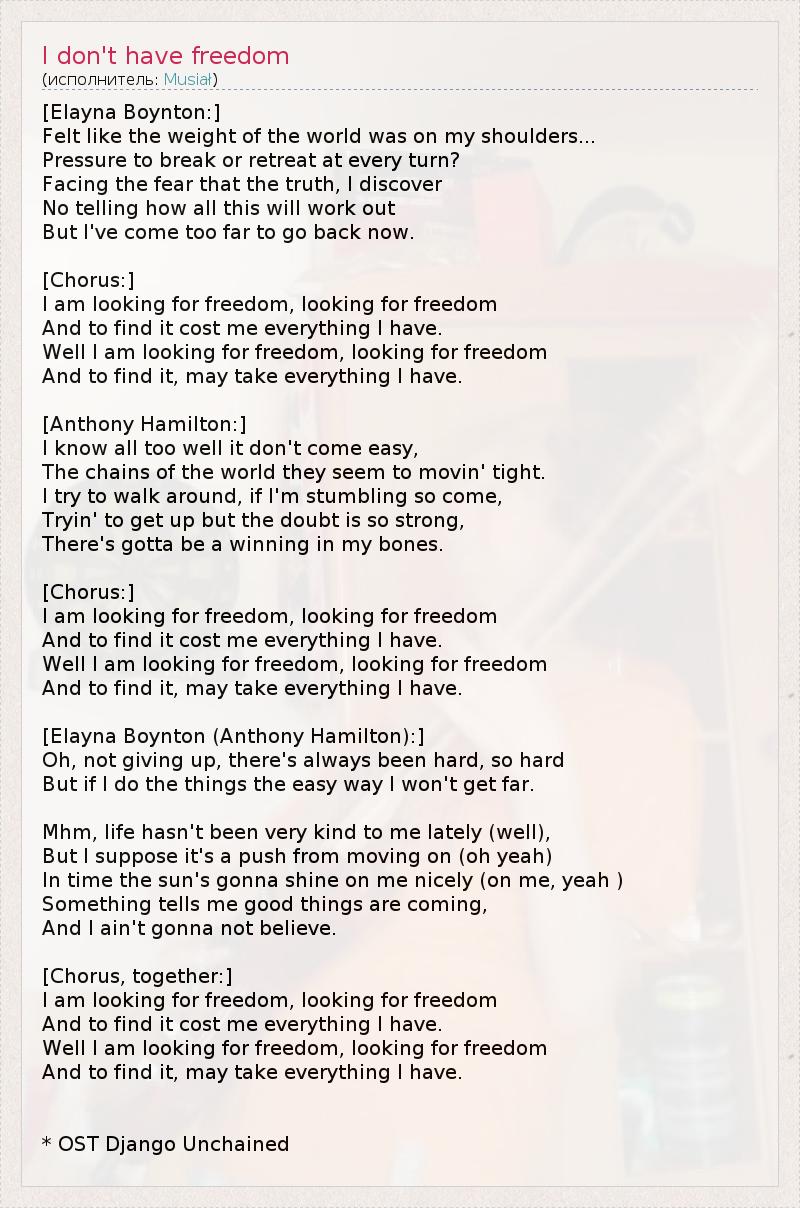 [Elayna Boynton:] Felt like the weight of the world was on my shoulders... Pressure to break or retreat at every turn? Facing the fear that the truth, I discover No telling how all this will work out But I've come too far to go back now. [Chorus:] I am looking for freedom, looking for freedom And to find it cost me everything I have. Well I am looking for freedom, looking for freedom And to find it, may take everything I have. [Anthony Hamilton:] I know all too well it don't come easy, The chains of the world they seem to movin' tight. I try to walk around, if I'm stumbling so come, Tryin' to get up but the doubt is so strong, There's gotta be a winning in my bones. [Chorus:] I am looking for freedom, looking for freedom And to find it cost me everything I have. Well I am looking for freedom, looking for freedom And to find it, may take everything I have. [Elayna Boynton (Anthony Hamilton):] Oh, not giving up, there's always been hard, so hard But if I do the things the easy way I won't get far. Mhm, life hasn't been very kind to me lately (well), But I suppose it's a push from moving on (oh yeah) In time the sun's gonna shine on me nicely (on me, yeah ) Something tells me good things are coming, And I ain't gonna not believe. [Chorus, together:] I am looking for freedom, looking for freedom And to find it cost me everything I have. Well I am looking for freedom, looking for freedom And to find it, may take everything I have. * OST Django Unchained
