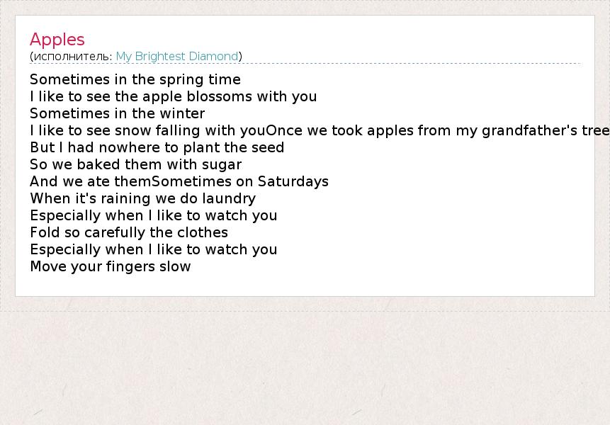 Sometimes in the spring time I like to see the apple blossoms with you Sometimes in the winter I like to see snow falling with youOnce we took apples from my grandfather's tree But I had nowhere to plant the seed So we baked them with sugar And we ate themSometimes on Saturdays When it's raining we do laundry Especially when I like to watch you Fold so carefully the clothes Especially when I like to watch you Move your fingers slow