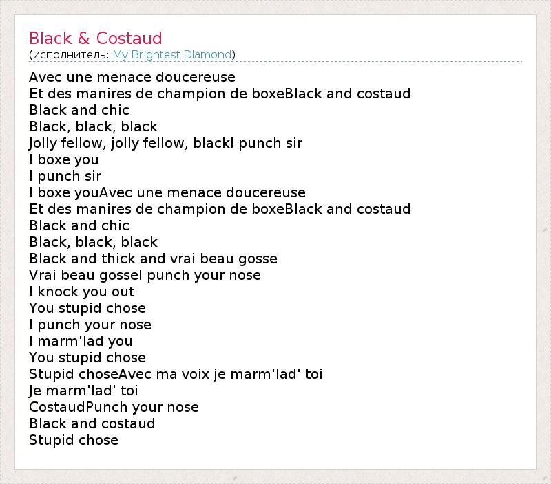 Avec une menace doucereuse Et des manires de champion de boxeBlack and costaud Black and chic Black, black, black Jolly fellow, jolly fellow, blackI punch sir I boxe you I punch sir I boxe youAvec une menace doucereuse Et des manires de champion de boxeBlack and costaud Black and chic Black, black, black Black and thick and vrai beau gosse Vrai beau gosseI punch your nose I knock you out You stupid chose I punch your nose I marm'lad you You stupid chose Stupid choseAvec ma voix je marm'lad' toi Je marm'lad' toi CostaudPunch your nose Black and costaud Stupid chose