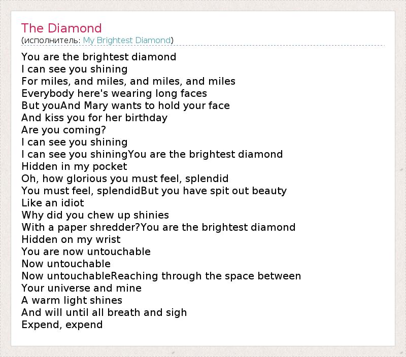 You are the brightest diamond I can see you shining For miles, and miles, and miles, and miles Everybody here's wearing long faces But youAnd Mary wants to hold your face And kiss you for her birthday Are you coming? I can see you shining I can see you shiningYou are the brightest diamond Hidden in my pocket Oh, how glorious you must feel, splendid You must feel, splendidBut you have spit out beauty Like an idiot Why did you chew up shinies With a paper shredder?You are the brightest diamond Hidden on my wrist You are now untouchable Now untouchable Now untouchableReaching through the space between Your universe and mine A warm light shines And will until all breath and sigh Expend, expend