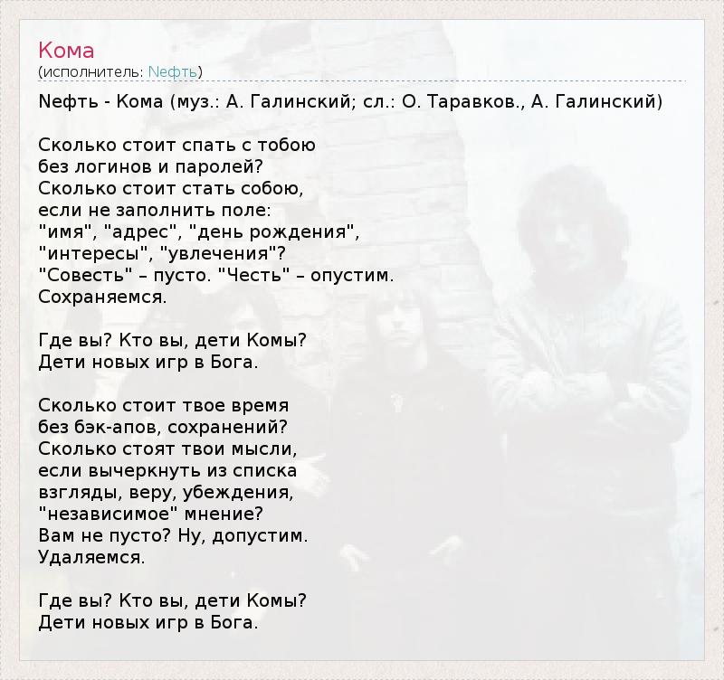 Nефть - Кома (муз.: А. Галинский; сл.: О. Таравков., А. Галинский) Сколько стоит спать с тобою без логинов и паролей? Сколько стоит стать собою, если не заполнить поле: "имя", "адрес", "день рождения", "интересы", "увлечения"? "Совесть" – пусто. "Честь" – опустим. Сохраняемся. Где вы? Кто вы, дети Комы? Дети новых игр в Бога. Сколько стоит твое время без бэк-апов, сохранений? Сколько стоят твои мысли, если вычеркнуть из списка взгляды, веру, убеждения, "независимое" мнение? Вам не пусто? Ну, допустим. Удаляемся. Где вы? Кто вы, дети Комы? Дети новых игр в Бога.