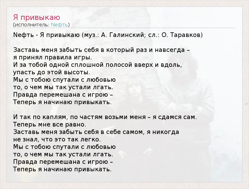 Nефть - Я привыкаю (муз.: А. Галинский; сл.: О. Таравков) Заставь меня забыть себя в который раз и навсегда – я принял правила игры. И за тобой одной сплошной полосой вверх и вдоль, упасть до этой высоты. Мы с тобою спутали с любовью то, о чем мы так устали лгать. Правда перемешана с игрою – Теперь я начинаю привыкать. И так по каплям, по частям возьми меня – я сдамся сам. Теперь мне все равно. Заставь меня забыть себя в себе самом, я никогда не знал, что это так легко. Мы с тобою спутали с любовью то, о чем мы так устали лгать. Правда перемешана с игрою – Теперь я начинаю привыкать.