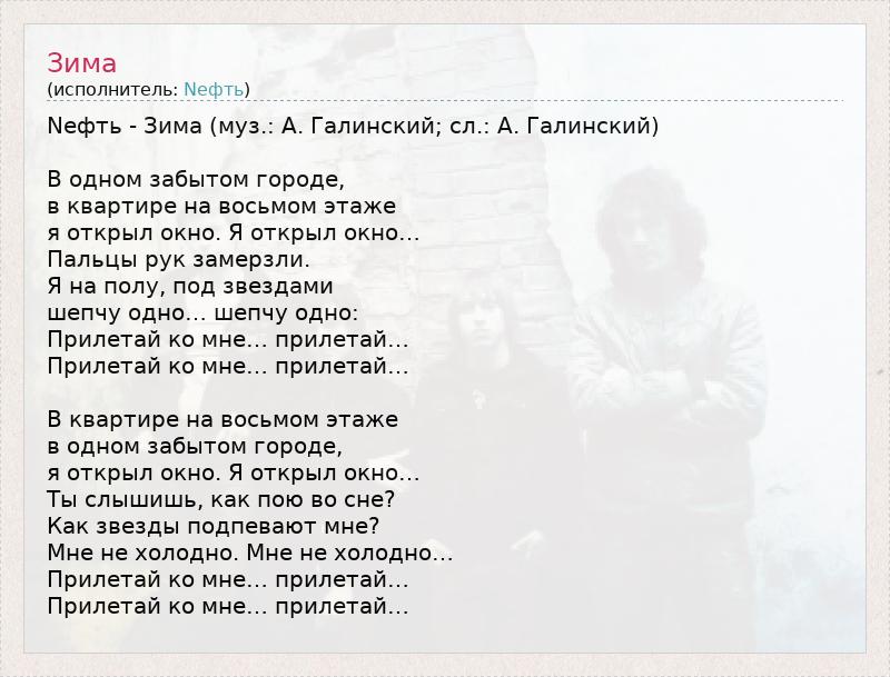 Nефть - Зима (муз.: А. Галинский; сл.: А. Галинский) В одном забытом городе, в квартире на восьмом этаже я открыл окно. Я открыл окно… Пальцы рук замерзли. Я на полу, под звездами шепчу одно… шепчу одно: Прилетай ко мне… прилетай… Прилетай ко мне… прилетай… В квартире на восьмом этаже в одном забытом городе, я открыл окно. Я открыл окно… Ты слышишь, как пою во сне? Как звезды подпевают мне? Мне не холодно. Мне не холодно… Прилетай ко мне… прилетай… Прилетай ко мне… прилетай…