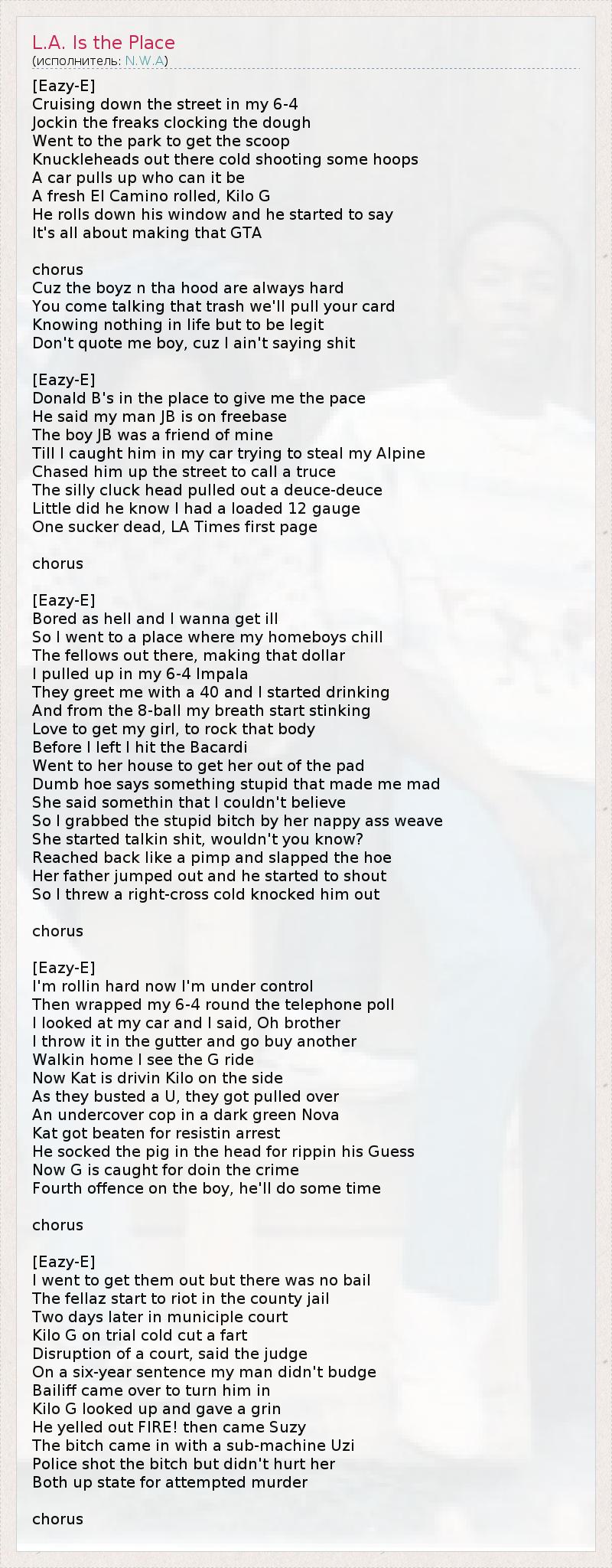 [Eazy-E] Cruising down the street in my 6-4 Jockin the freaks clocking the dough Went to the park to get the scoop Knuckleheads out there cold shooting some hoops A car pulls up who can it be A fresh El Camino rolled, Kilo G He rolls down his window and he started to say It's all about making that GTA chorus Cuz the boyz n tha hood are always hard You come talking that trash we'll pull your card Knowing nothing in life but to be legit Don't quote me boy, cuz I ain't saying shit [Eazy-E] Donald B's in the place to give me the pace He said my man JB is on freebase The boy JB was a friend of mine Till I caught him in my car trying to steal my Alpine Chased him up the street to call a truce The silly cluck head pulled out a deuce-deuce Little did he know I had a loaded 12 gauge One sucker dead, LA Times first page chorus [Eazy-E] Bored as hell and I wanna get ill So I went to a place where my homeboys chill The fellows out there, making that dollar I pulled up in my 6-4 Impala They greet me with a 40 and I started drinking And from the 8-ball my breath start stinking Love to get my girl, to rock that body Before I left I hit the Bacardi Went to her house to get her out of the pad Dumb hoe says something stupid that made me mad She said somethin that I couldn't believe So I grabbed the stupid bitch by her nappy ass weave She started talkin shit, wouldn't you know? Reached back like a pimp and slapped the hoe Her father jumped out and he started to shout So I threw a right-cross cold knocked him out chorus [Eazy-E] I'm rollin hard now I'm under control Then wrapped my 6-4 round the telephone poll I looked at my car and I said, Oh brother I throw it in the gutter and go buy another Walkin home I see the G ride Now Kat is drivin Kilo on the side As they busted a U, they got pulled over An undercover cop in a dark green Nova Kat got beaten for resistin arrest He socked the pig in the head for rippin his Guess Now G is caught for doin the crime Fourth offence on the boy, he'll do some time chorus [Eazy-E] I went to get them out but there was no bail The fellaz start to riot in the county jail Two days later in municiple court Kilo G on trial cold cut a fart Disruption of a court, said the judge On a six-year sentence my man didn't budge Bailiff came over to turn him in Kilo G looked up and gave a grin He yelled out FIRE! then came Suzy The bitch came in with a sub-machine Uzi Police shot the bitch but didn't hurt her Both up state for attempted murder chorus