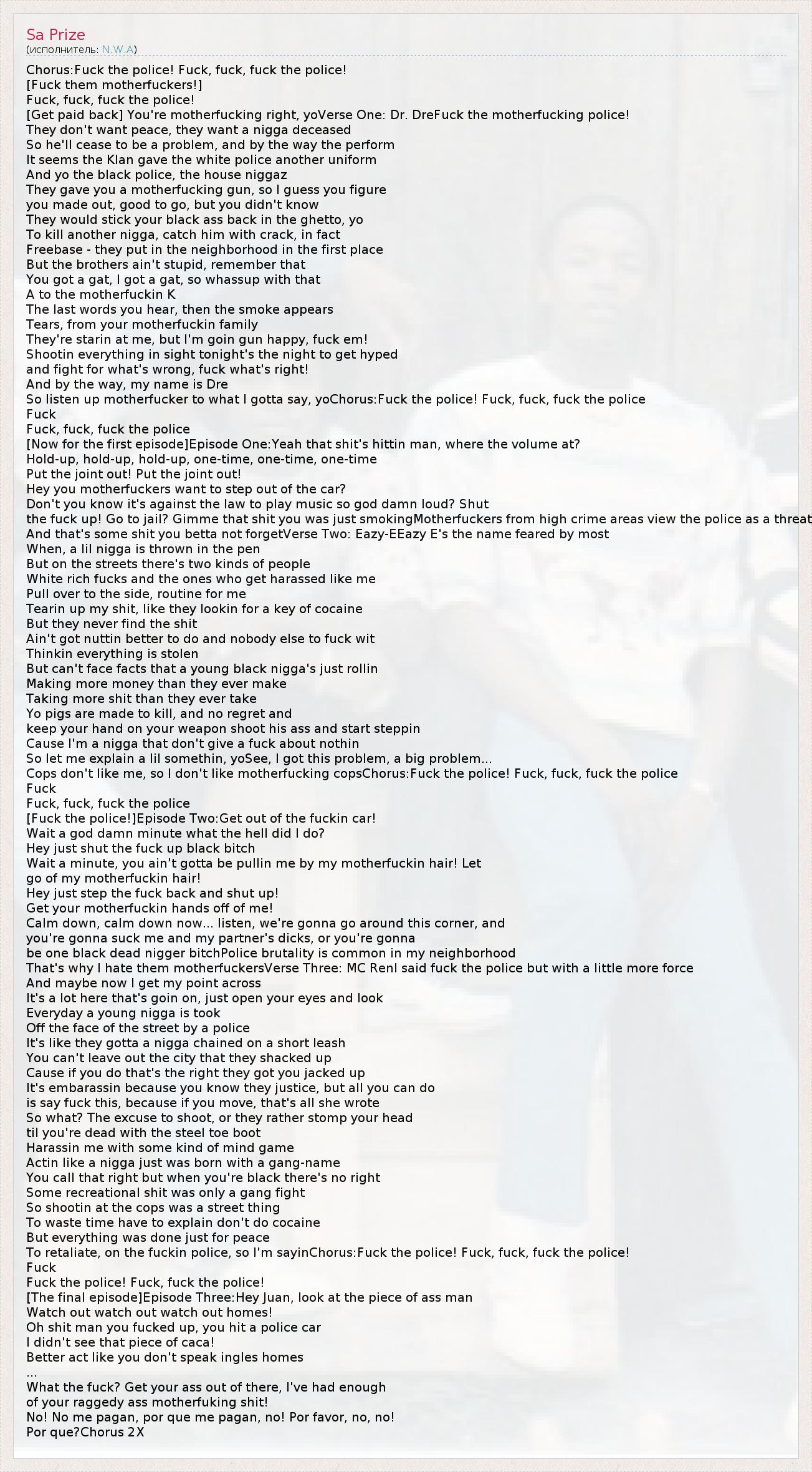 Chorus:Fuck the police! Fuck, fuck, fuck the police! [Fuck them motherfuckers!] Fuck, fuck, fuck the police! [Get paid back] You're motherfucking right, yoVerse One: Dr. DreFuck the motherfucking police! They don't want peace, they want a nigga deceased So he'll cease to be a problem, and by the way the perform It seems the Klan gave the white police another uniform And yo the black police, the house niggaz They gave you a motherfucking gun, so I guess you figure you made out, good to go, but you didn't know They would stick your black ass back in the ghetto, yo To kill another nigga, catch him with crack, in fact Freebase - they put in the neighborhood in the first place But the brothers ain't stupid, remember that You got a gat, I got a gat, so whassup with that A to the motherfuckin K The last words you hear, then the smoke appears Tears, from your motherfuckin family They're starin at me, but I'm goin gun happy, fuck em! Shootin everything in sight tonight's the night to get hyped and fight for what's wrong, fuck what's right! And by the way, my name is Dre So listen up motherfucker to what I gotta say, yoChorus:Fuck the police! Fuck, fuck, fuck the police Fuck Fuck, fuck, fuck the police [Now for the first episode]Episode One:Yeah that shit's hittin man, where the volume at? Hold-up, hold-up, hold-up, one-time, one-time, one-time Put the joint out! Put the joint out! Hey you motherfuckers want to step out of the car? Don't you know it's against the law to play music so god damn loud? Shut the fuck up! Go to jail? Gimme that shit you was just smokingMotherfuckers from high crime areas view the police as a threat And that's some shit you betta not forgetVerse Two: Eazy-EEazy E's the name feared by most When, a lil nigga is thrown in the pen But on the streets there's two kinds of people White rich fucks and the ones who get harassed like me Pull over to the side, routine for me Tearin up my shit, like they lookin for a key of cocaine But they never find the shit Ain't got nuttin better to do and nobody else to fuck wit Thinkin everything is stolen But can't face facts that a young black nigga's just rollin Making more money than they ever make Taking more shit than they ever take Yo pigs are made to kill, and no regret and keep your hand on your weapon shoot his ass and start steppin Cause I'm a nigga that don't give a fuck about nothin So let me explain a lil somethin, yoSee, I got this problem, a big problem... Cops don't like me, so I don't like motherfucking copsChorus:Fuck the police! Fuck, fuck, fuck the police Fuck Fuck, fuck, fuck the police [Fuck the police!]Episode Two:Get out of the fuckin car! Wait a god damn minute what the hell did I do? Hey just shut the fuck up black bitch Wait a minute, you ain't gotta be pullin me by my motherfuckin hair! Let go of my motherfuckin hair! Hey just step the fuck back and shut up! Get your motherfuckin hands off of me! Calm down, calm down now... listen, we're gonna go around this corner, and you're gonna suck me and my partner's dicks, or you're gonna be one black dead nigger bitchPolice brutality is common in my neighborhood That's why I hate them motherfuckersVerse Three: MC RenI said fuck the police but with a little more force And maybe now I get my point across It's a lot here that's goin on, just open your eyes and look Everyday a young nigga is took Off the face of the street by a police It's like they gotta a nigga chained on a short leash You can't leave out the city that they shacked up Cause if you do that's the right they got you jacked up It's embarassin because you know they justice, but all you can do is say fuck this, because if you move, that's all she wrote So what? The excuse to shoot, or they rather stomp your head til you're dead with the steel toe boot Harassin me with some kind of mind game Actin like a nigga just was born with a gang-name You call that right but when you're black there's no right Some recreational shit was only a gang fight So shootin at the cops was a street thing To waste time have to explain don't do cocaine But everything was done just for peace To retaliate, on the fuckin police, so I'm sayinChorus:Fuck the police! Fuck, fuck, fuck the police! Fuck Fuck the police! Fuck, fuck the police! [The final episode]Episode Three:Hey Juan, look at the piece of ass man Watch out watch out watch out homes! Oh shit man you fucked up, you hit a police car I didn't see that piece of caca! Better act like you don't speak ingles homes ... What the fuck? Get your ass out of there, I've had enough of your raggedy ass motherfuking shit! No! No me pagan, por que me pagan, no! Por favor, no, no! Por que?Chorus 2X