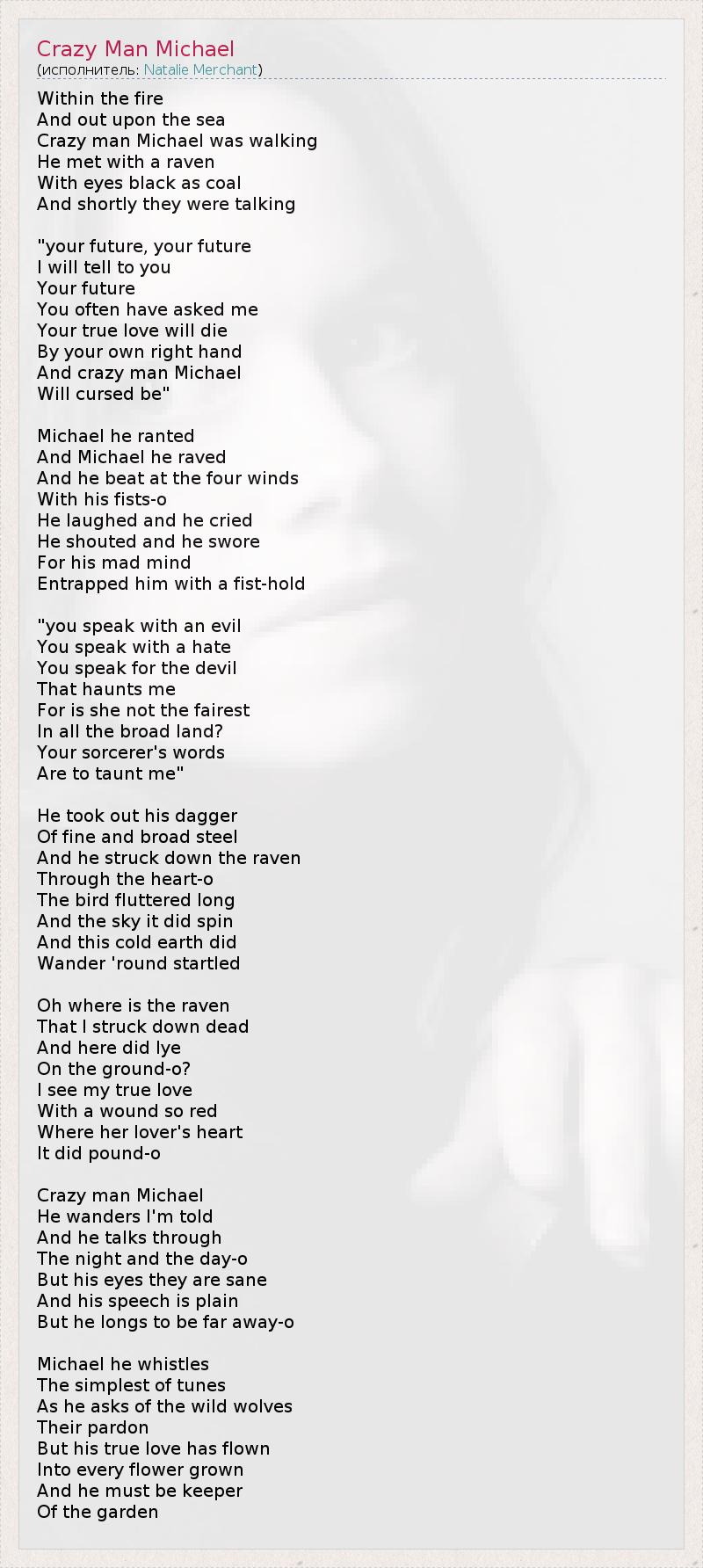 Within the fire And out upon the sea Crazy man Michael was walking He met with a raven With eyes black as coal And shortly they were talking "your future, your future I will tell to you Your future You often have asked me Your true love will die By your own right hand And crazy man Michael Will cursed be" Michael he ranted And Michael he raved And he beat at the four winds With his fists-o He laughed and he cried He shouted and he swore For his mad mind Entrapped him with a fist-hold "you speak with an evil You speak with a hate You speak for the devil That haunts me For is she not the fairest In all the broad land? Your sorcerer's words Are to taunt me" He took out his dagger Of fine and broad steel And he struck down the raven Through the heart-o The bird fluttered long And the sky it did spin And this cold earth did Wander 'round startled Oh where is the raven That I struck down dead And here did lye On the ground-o? I see my true love With a wound so red Where her lover's heart It did pound-o Crazy man Michael He wanders I'm told And he talks through The night and the day-o But his eyes they are sane And his speech is plain But he longs to be far away-o Michael he whistles The simplest of tunes As he asks of the wild wolves Their pardon But his true love has flown Into every flower grown And he must be keeper Of the garden