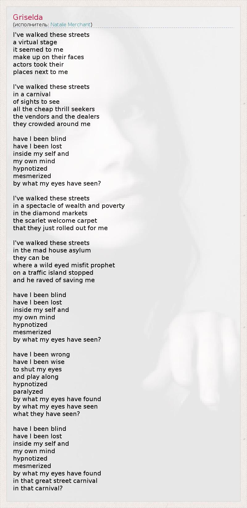 Это интересно:Американская певица и автор песен Натали Мерчант родилась 26 октября 1963 года в Джеймстауне (штат Нью-Йорк, США). Она с самого детства знакома с музыкой – ее дед играл на аккордеоне, мандолине и гитаре, а мать будущей певицы очень увлекалась творчеством The Beatles, Эла Грина и других исполнителей. Именно она в значительной мере повлияла на желание Натали заниматься музыкой. Долгое время Мерчант... продолжение