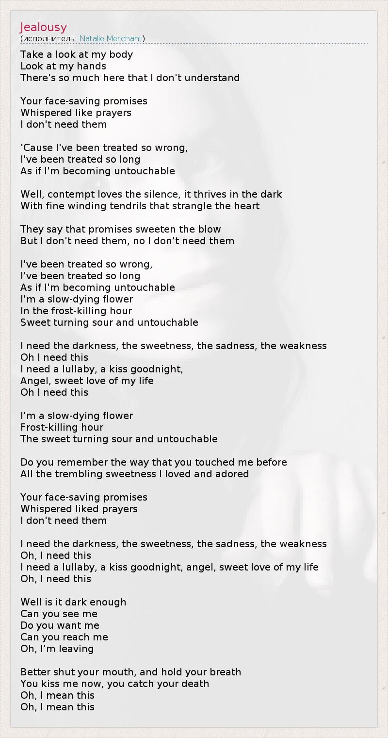Взгляни на моё тело, Посмотри на мои руки, В них столько того, что я не понимаю сама. Твое лицо говорит об обещаниях, Ты шепчешь их как молитвы, Но они не нужны мне. Потому что меня уже слишком сильно обманывали, И я слишком долго обманывалась, И теперь я стала недосягаемой. Да, презрение любит тишину, и процветает в темноте, И душит сердце своими прекрасными витыми прядями. Говорят, что обещания слаще, чем твое дыхание, Но мне они не нужны, нет, не нужны. Потому что меня и так слишком сильно обманывали, И я уже слишком долго обманывалась, и стала теперь недосягаемой. Я как медленно умирающий цветок На убивающем морозе: Сладость становится горечью и недоступностью. А мне нужна и темнота и сладость, твоя печаль и слабость, Мне нужно это все. Мне нужны колыбельные, поцелуи на ночь, То, как ты говоришь:"ангел" и "сладкая любовь моей жизни", Да, мне нужно это все. Я как медленно умирающий цветок На убивающем морозе: Сладость становится горечью и недоступностью. А помнишь как ты касался меня раньше, Со сладостной дрожью, которую я так любила и поклонялась? Твоё лицо говорило об обещаниях, Ты шептал их как молитвы, Но мне они не нужны. Мне нужна и темнота и сладость, твоя печаль и слабость, Мне нужно это все. Мне нужны коллыбельные, поцелуи на ночь, То, как та говоришь:"ангел" и "сладкая любовь моей жизни", Да, мне нужно это все. Ну, теперь достаточно темно? Сможешь меня увидеть? Хочешь ли ты меня? Сможешь добиться меня? Или я уйду? Лучше бы ты удержался от обещаниий, замолчал, придержал дыхание И прямо сейчас поцеловал меня, встретил свою смерть. Да, это то, что я имела ввиду, Именно то, что я имела ввиду.
