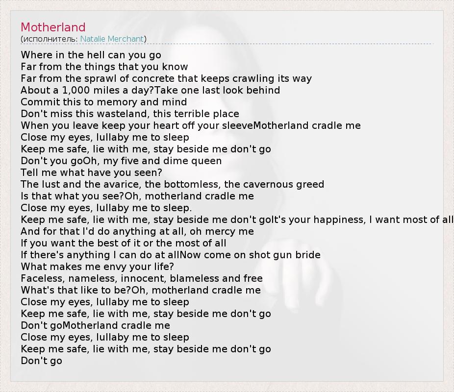 Where in the hell can you go Far from the things that you know Far from the sprawl of concrete that keeps crawling its way About a 1,000 miles a day?Take one last look behind Commit this to memory and mind Don't miss this wasteland, this terrible place When you leave keep your heart off your sleeveMotherland cradle me Close my eyes, lullaby me to sleep Keep me safe, lie with me, stay beside me don't go Don't you goOh, my five and dime queen Tell me what have you seen? The lust and the avarice, the bottomless, the cavernous greed Is that what you see?Oh, motherland cradle me Close my eyes, lullaby me to sleep. Keep me safe, lie with me, stay beside me don't goIt's your happiness, I want most of all And for that I'd do anything at all, oh mercy me If you want the best of it or the most of all If there's anything I can do at allNow come on shot gun bride What makes me envy your life? Faceless, nameless, innocent, blameless and free What's that like to be?Oh, motherland cradle me Close my eyes, lullaby me to sleep Keep me safe, lie with me, stay beside me don't go Don't goMotherland cradle me Close my eyes, lullaby me to sleep Keep me safe, lie with me, stay beside me don't go Don't go