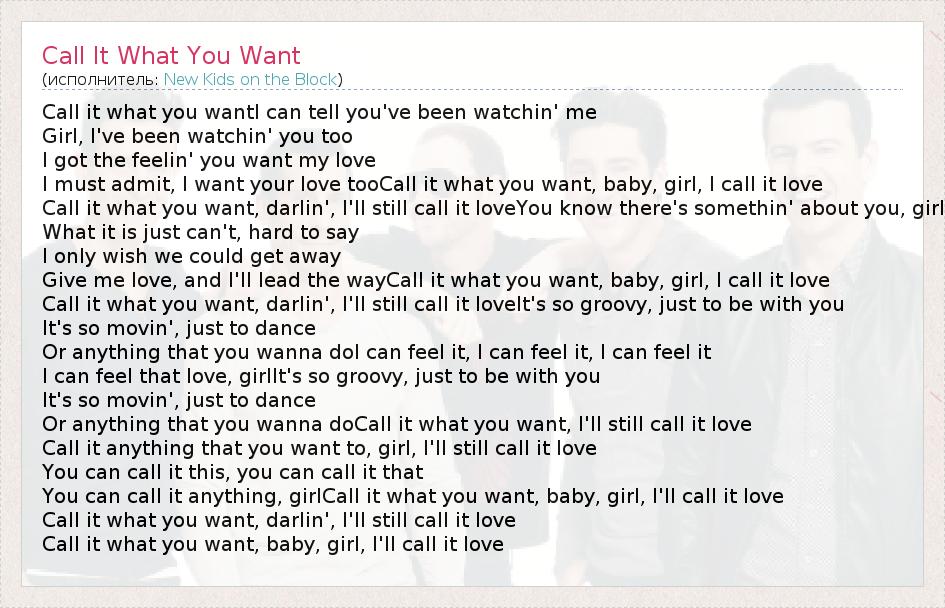 Call it what you wantI can tell you've been watchin' me Girl, I've been watchin' you too I got the feelin' you want my love I must admit, I want your love tooCall it what you want, baby, girl, I call it love Call it what you want, darlin', I'll still call it loveYou know there's somethin' about you, girl What it is just can't, hard to say I only wish we could get away Give me love, and I'll lead the wayCall it what you want, baby, girl, I call it love Call it what you want, darlin', I'll still call it loveIt's so groovy, just to be with you It's so movin', just to dance Or anything that you wanna doI can feel it, I can feel it, I can feel it I can feel that love, girlIt's so groovy, just to be with you It's so movin', just to dance Or anything that you wanna doCall it what you want, I'll still call it love Call it anything that you want to, girl, I'll still call it love You can call it this, you can call it that You can call it anything, girlCall it what you want, baby, girl, I'll call it love Call it what you want, darlin', I'll still call it love Call it what you want, baby, girl, I'll call it love