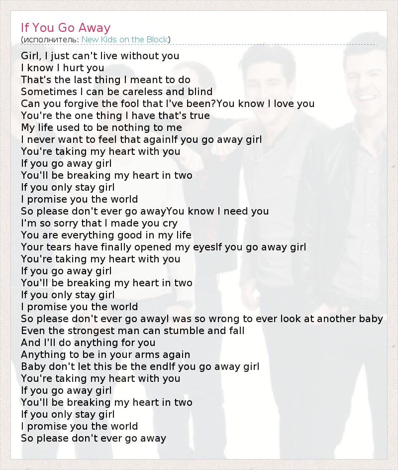 Girl, I just can't live without you I know I hurt you That's the last thing I meant to do Sometimes I can be careless and blind Can you forgive the fool that I've been?You know I love you You're the one thing I have that's true My life used to be nothing to me I never want to feel that againIf you go away girl You're taking my heart with you If you go away girl You'll be breaking my heart in two If you only stay girl I promise you the world So please don't ever go awayYou know I need you I'm so sorry that I made you cry You are everything good in my life Your tears have finally opened my eyesIf you go away girl You're taking my heart with you If you go away girl You'll be breaking my heart in two If you only stay girl I promise you the world So please don't ever go awayI was so wrong to ever look at another baby Even the strongest man can stumble and fall And I'll do anything for you Anything to be in your arms again Baby don't let this be the endIf you go away girl You're taking my heart with you If you go away girl You'll be breaking my heart in two If you only stay girl I promise you the world So please don't ever go away