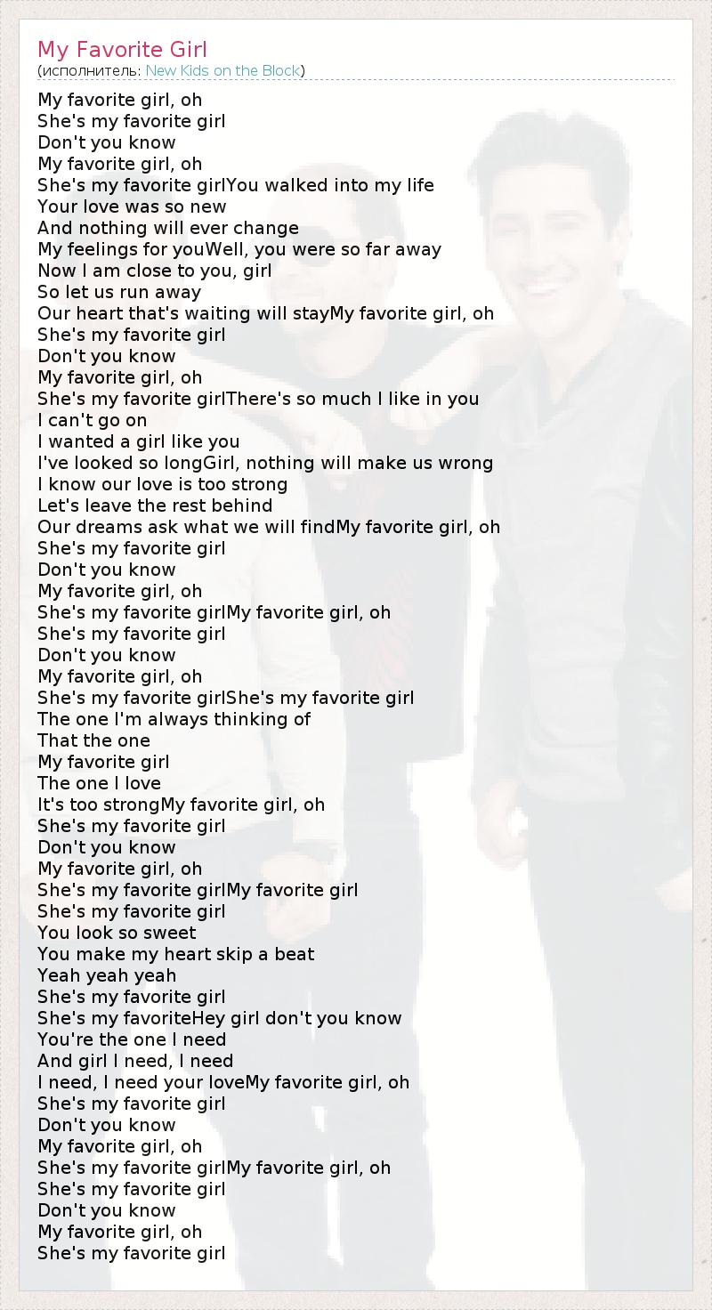 My favorite girl, oh She's my favorite girl Don't you know My favorite girl, oh She's my favorite girlYou walked into my life Your love was so new And nothing will ever change My feelings for youWell, you were so far away Now I am close to you, girl So let us run away Our heart that's waiting will stayMy favorite girl, oh She's my favorite girl Don't you know My favorite girl, oh She's my favorite girlThere's so much I like in you I can't go on I wanted a girl like you I've looked so longGirl, nothing will make us wrong I know our love is too strong Let's leave the rest behind Our dreams ask what we will findMy favorite girl, oh She's my favorite girl Don't you know My favorite girl, oh She's my favorite girlMy favorite girl, oh She's my favorite girl Don't you know My favorite girl, oh She's my favorite girlShe's my favorite girl The one I'm always thinking of That the one My favorite girl The one I love It's too strongMy favorite girl, oh She's my favorite girl Don't you know My favorite girl, oh She's my favorite girlMy favorite girl She's my favorite girl You look so sweet You make my heart skip a beat Yeah yeah yeah She's my favorite girl She's my favoriteHey girl don't you know You're the one I need And girl I need, I need I need, I need your loveMy favorite girl, oh She's my favorite girl Don't you know My favorite girl, oh She's my favorite girlMy favorite girl, oh She's my favorite girl Don't you know My favorite girl, oh She's my favorite girl