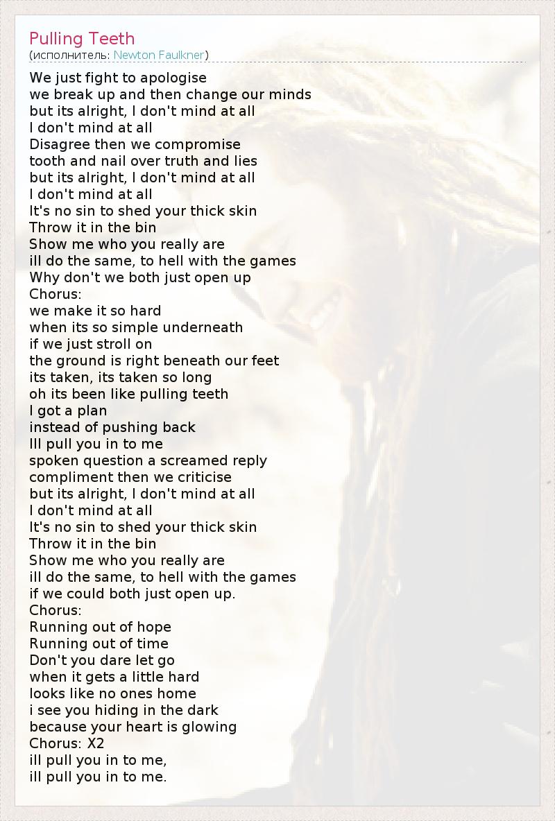 We just fight to apologise we break up and then change our minds but its alright, I don't mind at all I don't mind at all Disagree then we compromise tooth and nail over truth and lies but its alright, I don't mind at all I don't mind at all It's no sin to shed your thick skin Throw it in the bin Show me who you really are ill do the same, to hell with the games Why don't we both just open up Chorus: we make it so hard when its so simple underneath if we just stroll on the ground is right beneath our feet its taken, its taken so long oh its been like pulling teeth I got a plan instead of pushing back Ill pull you in to me spoken question a screamed reply compliment then we criticise but its alright, I don't mind at all I don't mind at all It's no sin to shed your thick skin Throw it in the bin Show me who you really are ill do the same, to hell with the games if we could both just open up. Chorus: Running out of hope Running out of time Don't you dare let go when it gets a little hard looks like no ones home i see you hiding in the dark because your heart is glowing Chorus: X2 ill pull you in to me, ill pull you in to me.
