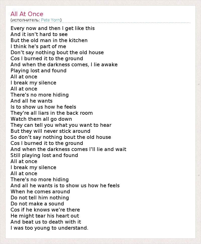 Every now and then I get like this And it isn't hard to see But the old man in the kitchen I think he's part of me Don't say nothing bout the old house Cos I burned it to the ground And when the darkness comes, I lie awake Playing lost and found All at once I break my silence All at once There's no more hiding And all he wants Is to show us how he feels They're all liars in the back room Watch them all go down They can tell you what you want to hear But they will never stick around So don't say nothing bout the old house Cos I burned it to the ground And when the darkness comes I'll lie and wait Still playing lost and found All at once I break my silence All at once There's no more hiding And all he wants is to show us how he feels When he comes around Do not tell him nothing Do not make a sound Cos if he knows we're there He might tear his heart out And beat us to death with it I was too young to understand.