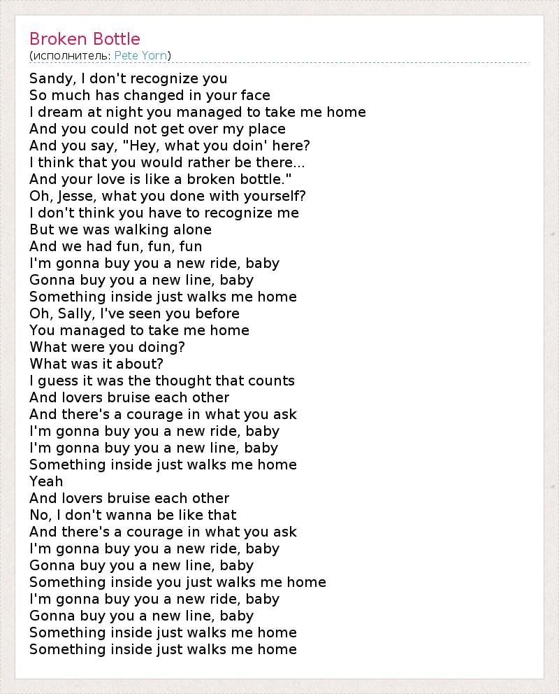 Sandy, I don't recognize you So much has changed in your face I dream at night you managed to take me home And you could not get over my place And you say, "Hey, what you doin' here? I think that you would rather be there... And your love is like a broken bottle." Oh, Jesse, what you done with yourself? I don't think you have to recognize me But we was walking alone And we had fun, fun, fun I'm gonna buy you a new ride, baby Gonna buy you a new line, baby Something inside just walks me home Oh, Sally, I've seen you before You managed to take me home What were you doing? What was it about? I guess it was the thought that counts And lovers bruise each other And there's a courage in what you ask I'm gonna buy you a new ride, baby I'm gonna buy you a new line, baby Something inside just walks me home Yeah And lovers bruise each other No, I don't wanna be like that And there's a courage in what you ask I'm gonna buy you a new ride, baby Gonna buy you a new line, baby Something inside you just walks me home I'm gonna buy you a new ride, baby Gonna buy you a new line, baby Something inside just walks me home Something inside just walks me home