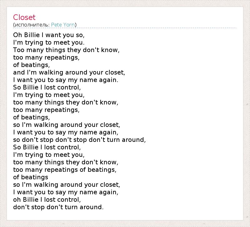 Oh Billie I want you so, I'm trying to meet you. Too many things they don't know, too many repeatings, of beatings, and I'm walking around your closet, I want you to say my name again. So Billie I lost control, I'm trying to meet you, too many things they don't know, too many repeatings, of beatings, so I'm walking around your closet, I want you to say my name again, so don't stop don't stop don't turn around, So Billie I lost control, I'm trying to meet you, too many things they don't know, too many repeatings of beatings, of beatings so I'm walking around your closet, I want you to say my name again, oh Billie I lost control, don't stop don't turn around.