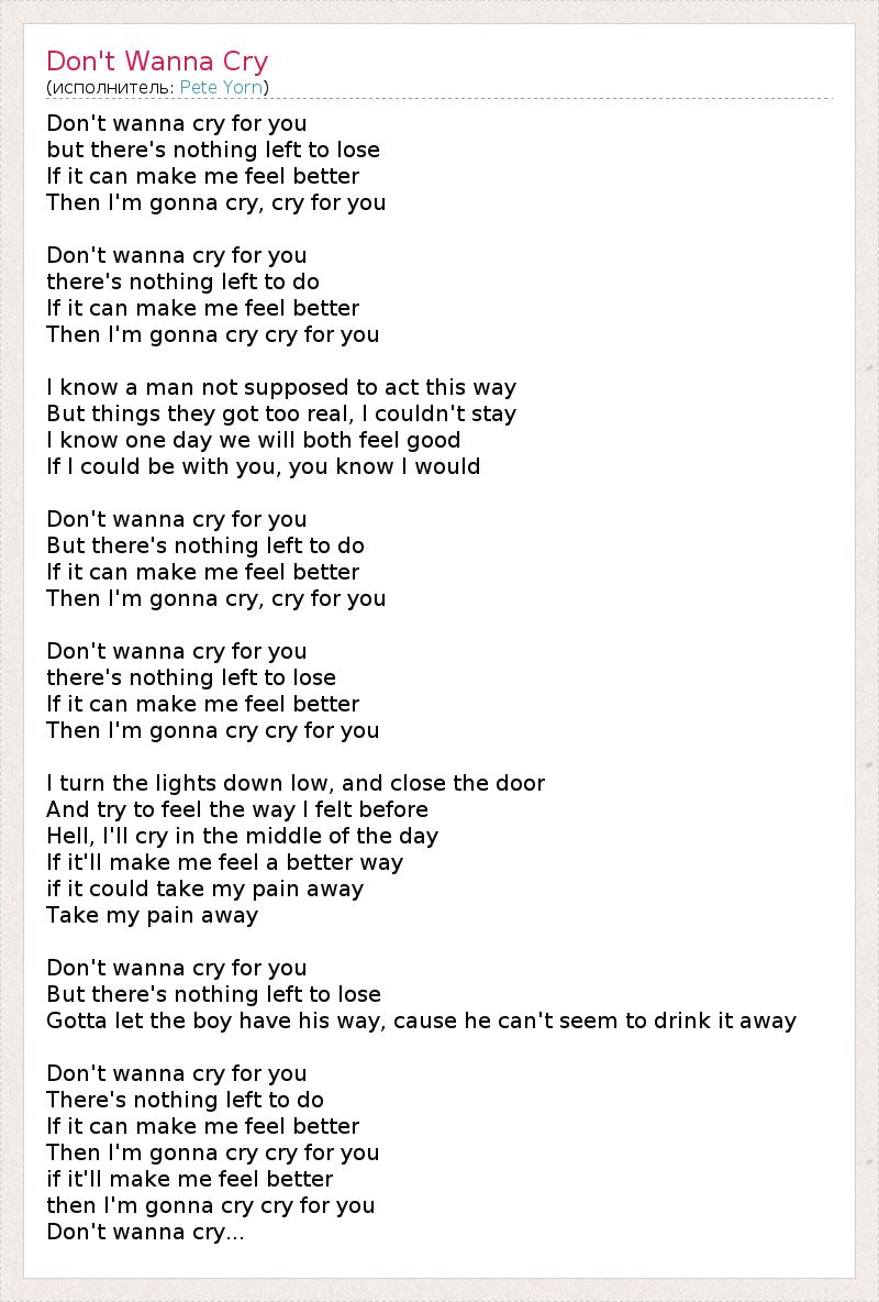 Не хочу плакать по тебе, Но больше нечего терять. Если от этого мне станет лучше, Тогда я поплачу, поплачу по тебе. Не хочу плакать по тебе, Делать больше нечего. Если от этого мне станет лучше, Тогда я поплачу, поплачу по тебе. Я знаю, мужчине не положено так себя вести, Но вещи стали слишком реальны, я не мог остаться. Знаю, однажды мы станем счастливыми людьми. Если бы я мог бы остаться с тобой, то с удовольствием остался бы. Не хочу плакать по тебе, Но делать больше нечего. Если от этого мне станет лучше, Тогда я поплачу, поплачу по тебе. Не хочу плакать по тебе, Больше нечего терять. Если от этого мне станет лучше, Тогда я поплачу, поплачу по тебе. Я выключил свет, закрыл дверь, И попробовал снова испытать то знакомое чувство. Черт, я готов расплакаться средь бела дня, Если мне от этого станет лучше, Если это избавит меня от боли, Избавит меня от боли. Не хочу плакать по тебе, Но больше нечего терять. Нужно позволить парню идти своим путем, Потому что он не собирается напиваться с горя. Не хочу плакать по тебе, Больше нечего делать. Если мне от этого станет лучше, Тогда я поплачу, поплачу по тебе, Если мне от этого станет лучше, Тогда я поплачу, поплачу по тебе. Не хочу плакать.