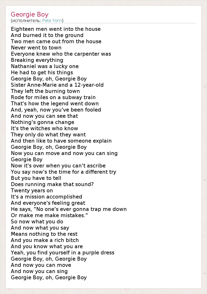 Eighteen men went into the house And burned it to the ground Two men came out from the house Never went to town Everyone knew who the carpenter was Breaking everything Nathaniel was a lucky one He had to get his things Georgie Boy, oh, Georgie Boy Sister Anne-Marie and a 12-year-old They left the burning town Rode for miles on a subway train That's how the legend went down And, yeah, now you've been fooled And now you can see that Nothing's gonna change It's the witches who know They only do what they want And then like to have someone explain Georgie Boy, oh, Georgie Boy Now you can move and now you can sing Georgie Boy Now it's over when you can't ascribe You say now's the time for a different try But you have to tell Does running make that sound? Twenty years on It's a mission accomplished And everyone's feeling great He says, "No one's ever gonna trap me down Or make me make mistakes." So now what you do And now what you say Means nothing to the rest And you make a rich bitch And you know what you are Yeah, you find yourself in a purple dress Georgie Boy, oh, Georgie Boy And now you can move And now you can sing Georgie Boy, oh, Georgie Boy