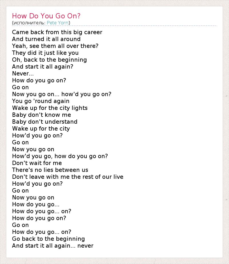 Came back from this big career And turned it all around Yeah, see them all over there? They did it just like you Oh, back to the beginning And start it all again? Never... How do you go on? Go on Now you go on... how'd you go on? You go 'round again Wake up for the city lights Baby don't know me Baby don't understand Wake up for the city How'd you go on? Go on Now you go on How'd you go, how do you go on? Don't wait for me There's no lies between us Don't leave with me the rest of our live How'd you go on? Go on Now you go on How do you go... How do you go... on? How do you go on? Go on How do you go... on? Go back to the beginning And start it all again... never