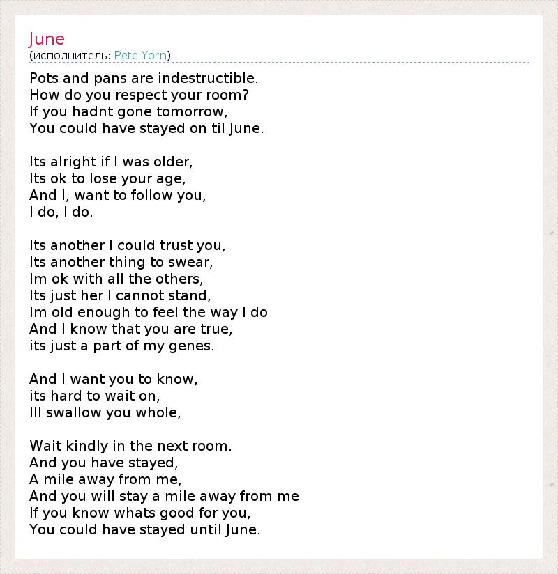 Pots and pans are indestructible. How do you respect your room? If you hadnt gone tomorrow, You could have stayed on til June. Its alright if I was older, Its ok to lose your age, And I, want to follow you, I do, I do. Its another I could trust you, Its another thing to swear, Im ok with all the others, Its just her I cannot stand, Im old enough to feel the way I do And I know that you are true, its just a part of my genes. And I want you to know, its hard to wait on, Ill swallow you whole, Wait kindly in the next room. And you have stayed, A mile away from me, And you will stay a mile away from me If you know whats good for you, You could have stayed until June.