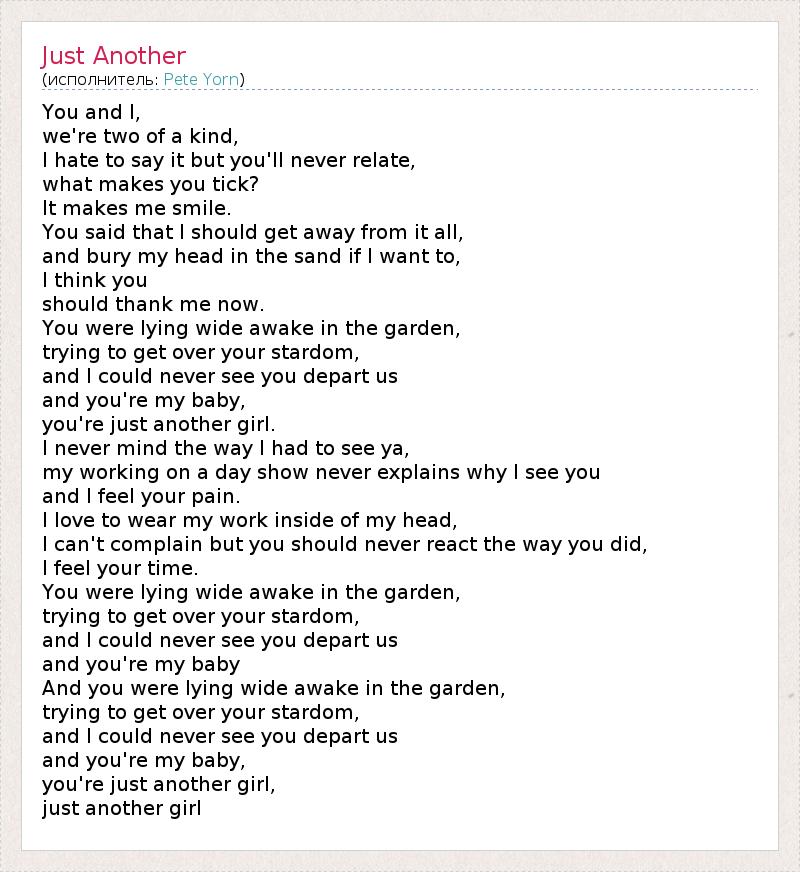 You and I, we're two of a kind, I hate to say it but you'll never relate, what makes you tick? It makes me smile. You said that I should get away from it all, and bury my head in the sand if I want to, I think you should thank me now. You were lying wide awake in the garden, trying to get over your stardom, and I could never see you depart us and you're my baby, you're just another girl. I never mind the way I had to see ya, my working on a day show never explains why I see you and I feel your pain. I love to wear my work inside of my head, I can't complain but you should never react the way you did, I feel your time. You were lying wide awake in the garden, trying to get over your stardom, and I could never see you depart us and you're my baby And you were lying wide awake in the garden, trying to get over your stardom, and I could never see you depart us and you're my baby, you're just another girl, just another girl