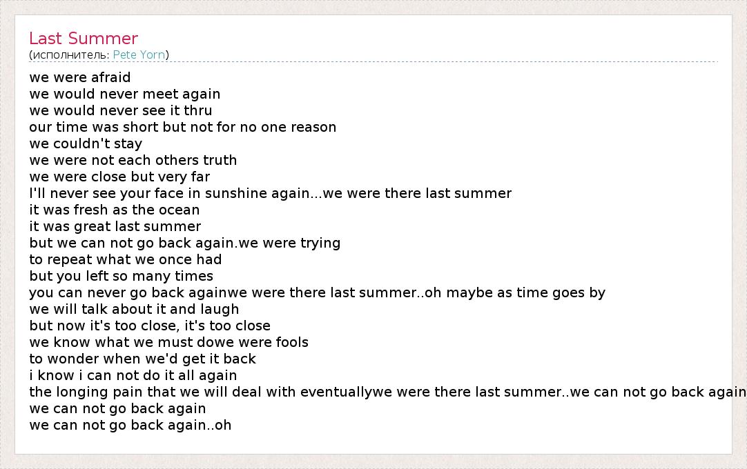 we were afraid we would never meet again we would never see it thru our time was short but not for no one reason we couldn't stay we were not each others truth we were close but very far I'll never see your face in sunshine again...we were there last summer it was fresh as the ocean it was great last summer but we can not go back again.we were trying to repeat what we once had but you left so many times you can never go back againwe were there last summer..oh maybe as time goes by we will talk about it and laugh but now it's too close, it's too close we know what we must dowe were fools to wonder when we'd get it back i know i can not do it all again the longing pain that we will deal with eventuallywe were there last summer..we can not go back again we can not go back again we can not go back again..oh