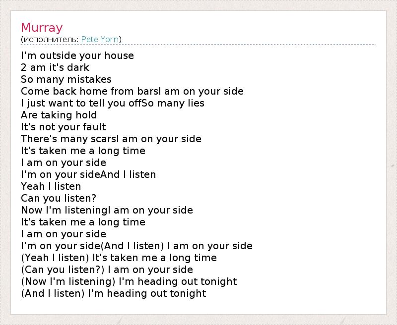 I'm outside your house 2 am it's dark So many mistakes Come back home from barsI am on your side I just want to tell you offSo many lies Are taking hold It's not your fault There's many scarsI am on your side It's taken me a long time I am on your side I'm on your sideAnd I listen Yeah I listen Can you listen? Now I'm listeningI am on your side It's taken me a long time I am on your side I'm on your side(And I listen) I am on your side (Yeah I listen) It's taken me a long time (Can you listen?) I am on your side (Now I'm listening) I'm heading out tonight (And I listen) I'm heading out tonight