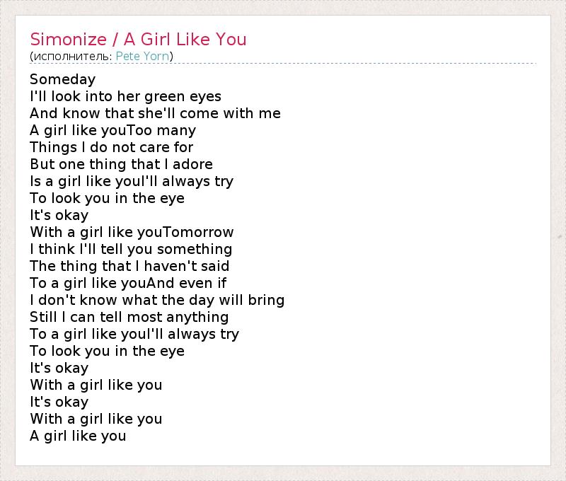 Someday I'll look into her green eyes And know that she'll come with me A girl like youToo many Things I do not care for But one thing that I adore Is a girl like youI'll always try To look you in the eye It's okay With a girl like youTomorrow I think I'll tell you something The thing that I haven't said To a girl like youAnd even if I don't know what the day will bring Still I can tell most anything To a girl like youI'll always try To look you in the eye It's okay With a girl like you It's okay With a girl like you A girl like you
