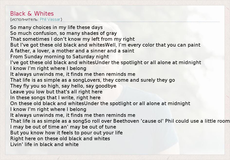 So many choices in my life these days So much confusion, so many shades of gray That sometimes I don't know my left from my right But I've got these old black and whitesWell, I'm every color that you can paint A father, a lover, a mother and a sinner and a saint From Sunday morning to Saturday night I've got these old black and whitesUnder the spotlight or all alone at midnight I know I'm right where I belong It always unwinds me, it finds me then reminds me That life is as simple as a songLovers, they come and surely they go They fly you so high, say hello, say goodbye Leave you low but that's all right here In these songs that I write, right here On these old black and whitesUnder the spotlight or all alone at midnight I know I'm right where I belong It always unwinds me, it finds me then reminds me That life is as simple as a songSo roll over Beethoven 'cause ol' Phil could use a little room I may be out of time an' may be out of tune But you know how it feels to pour out your life Right here on these old black and whites Livin' life in black and white