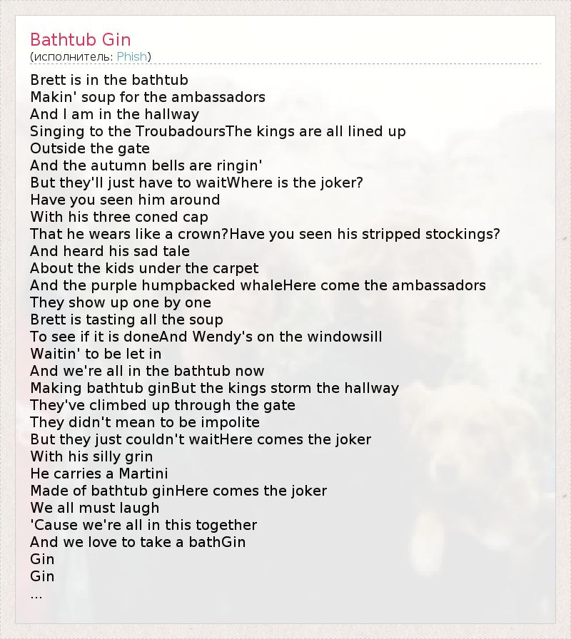Brett is in the bathtub Makin' soup for the ambassadors And I am in the hallway Singing to the TroubadoursThe kings are all lined up Outside the gate And the autumn bells are ringin' But they'll just have to waitWhere is the joker? Have you seen him around With his three coned cap That he wears like a crown?Have you seen his stripped stockings? And heard his sad tale About the kids under the carpet And the purple humpbacked whaleHere come the ambassadors They show up one by one Brett is tasting all the soup To see if it is doneAnd Wendy's on the windowsill Waitin' to be let in And we're all in the bathtub now Making bathtub ginBut the kings storm the hallway They've climbed up through the gate They didn't mean to be impolite But they just couldn't waitHere comes the joker With his silly grin He carries a Martini Made of bathtub ginHere comes the joker We all must laugh 'Cause we're all in this together And we love to take a bathGin Gin Gin ...