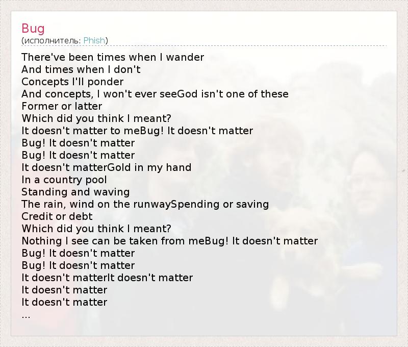 There've been times when I wander And times when I don't Concepts I'll ponder And concepts, I won't ever seeGod isn't one of these Former or latter Which did you think I meant? It doesn't matter to meBug! It doesn't matter Bug! It doesn't matter Bug! It doesn't matter It doesn't matterGold in my hand In a country pool Standing and waving The rain, wind on the runwaySpending or saving Credit or debt Which did you think I meant? Nothing I see can be taken from meBug! It doesn't matter Bug! It doesn't matter Bug! It doesn't matter It doesn't matterIt doesn't matter It doesn't matter It doesn't matter ...